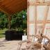 Die überdachte Lounge-Sitzgruppe lädt zum Verweilen ein und offenbart einen fantastischen Blick auf weite Wiesen und Wälder.