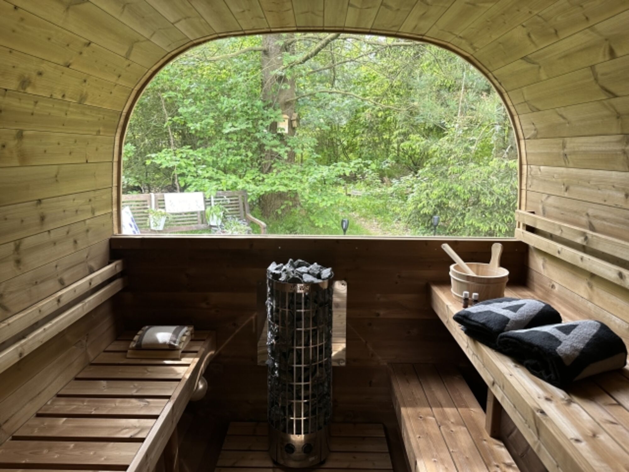 Seit 2024 steht unseren Gästen gegen Aufpreis unsere Panoramasauna im Garten zur Verfügung.