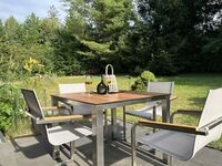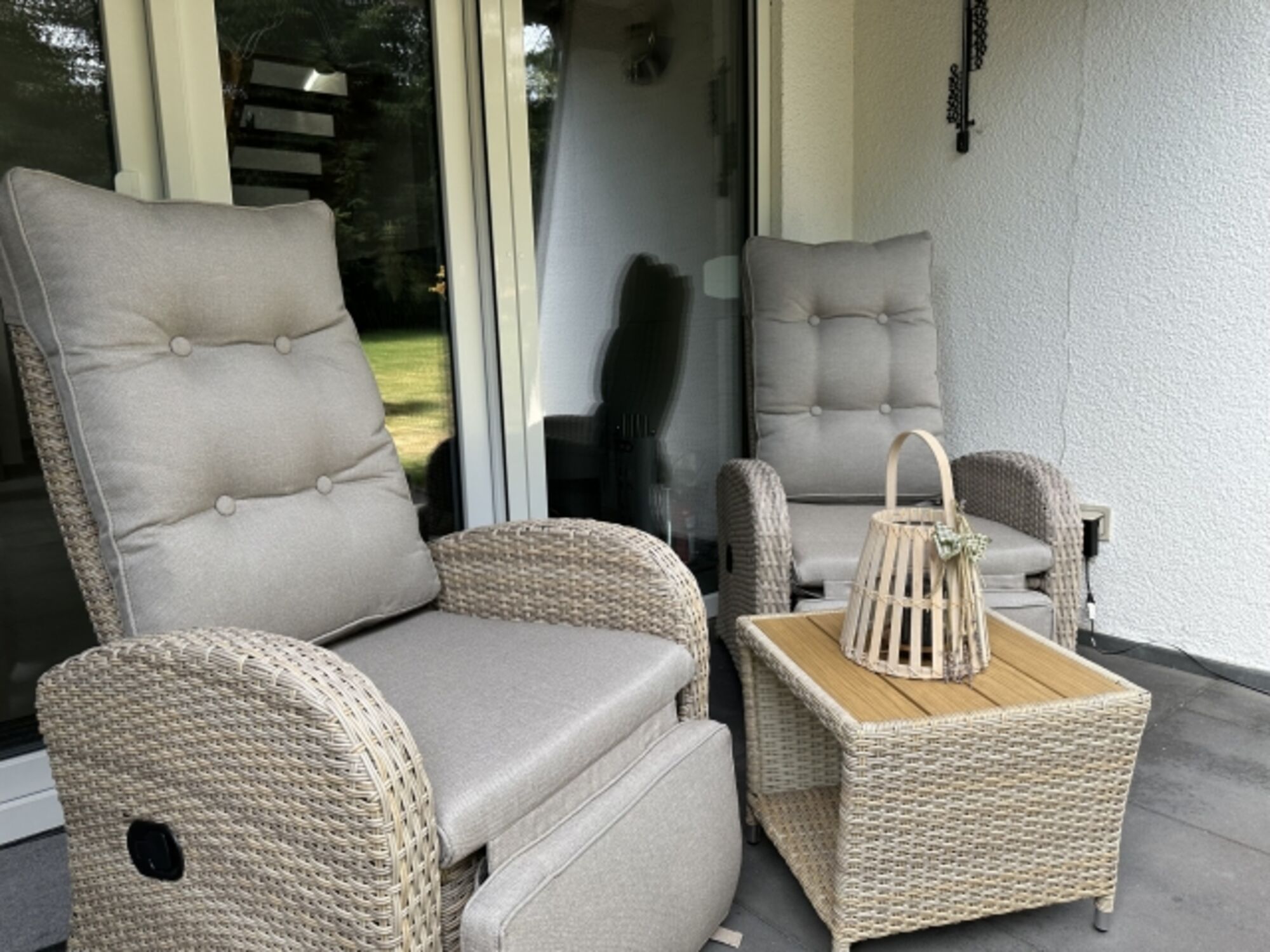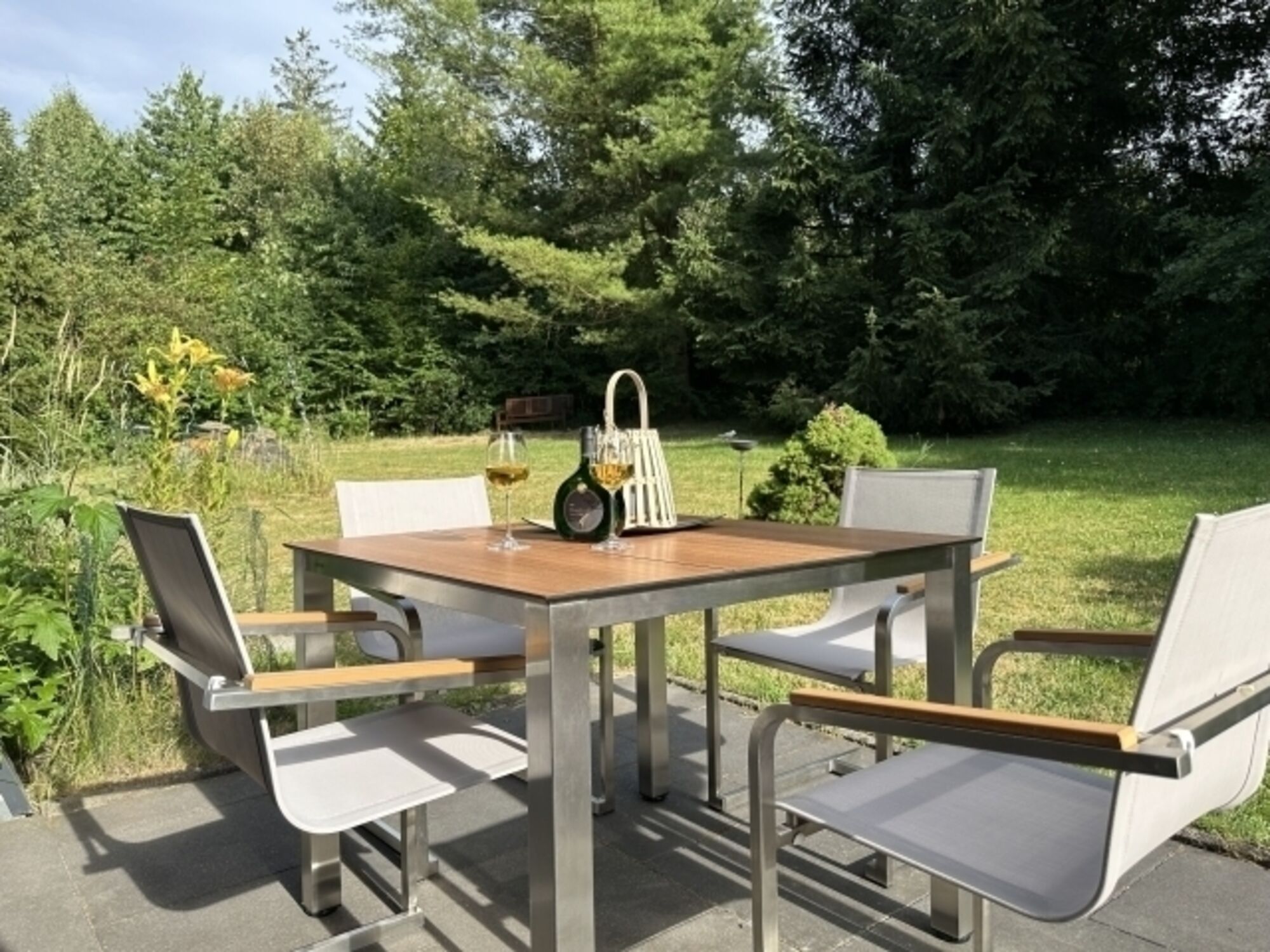 Auf der gemütlichen Terrasse befinden sich 2 hochwertige Loungemöbel, ein Sonnenschirm, sowie ein komfortabler Edelstahl-Esstisch mit passenden Stühlen.
