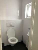 Die Toilette befindet sich in einem separaten Raum mit Fenster.