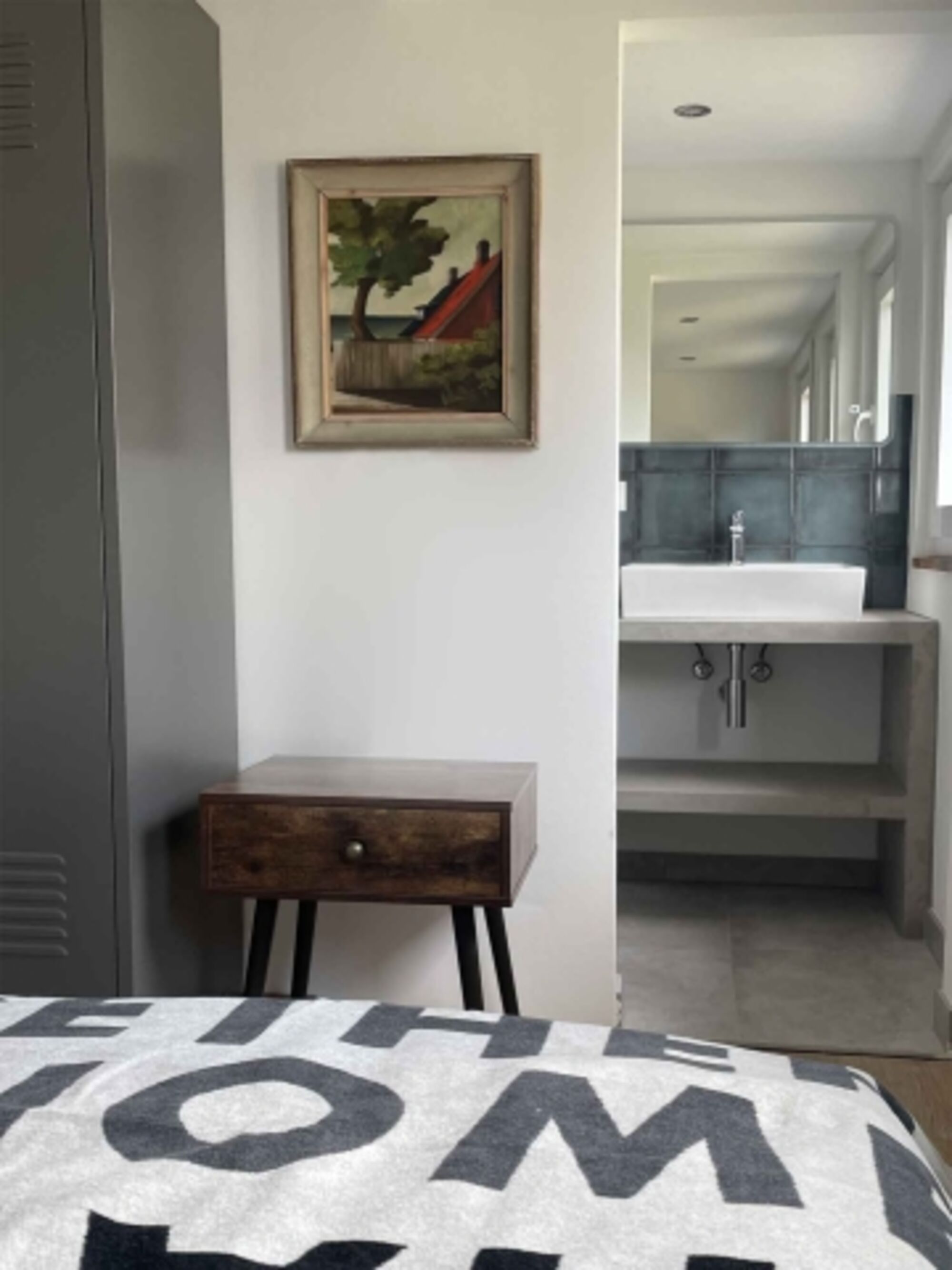 Im Schlafzimmer steht ein geräumiges 160cm Bett zur Verfügung, und durch eine Schiebetür gelangen Sie in das angrenzende Tageslichtbad mit einer großzügigen Dusche.