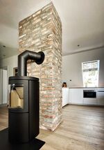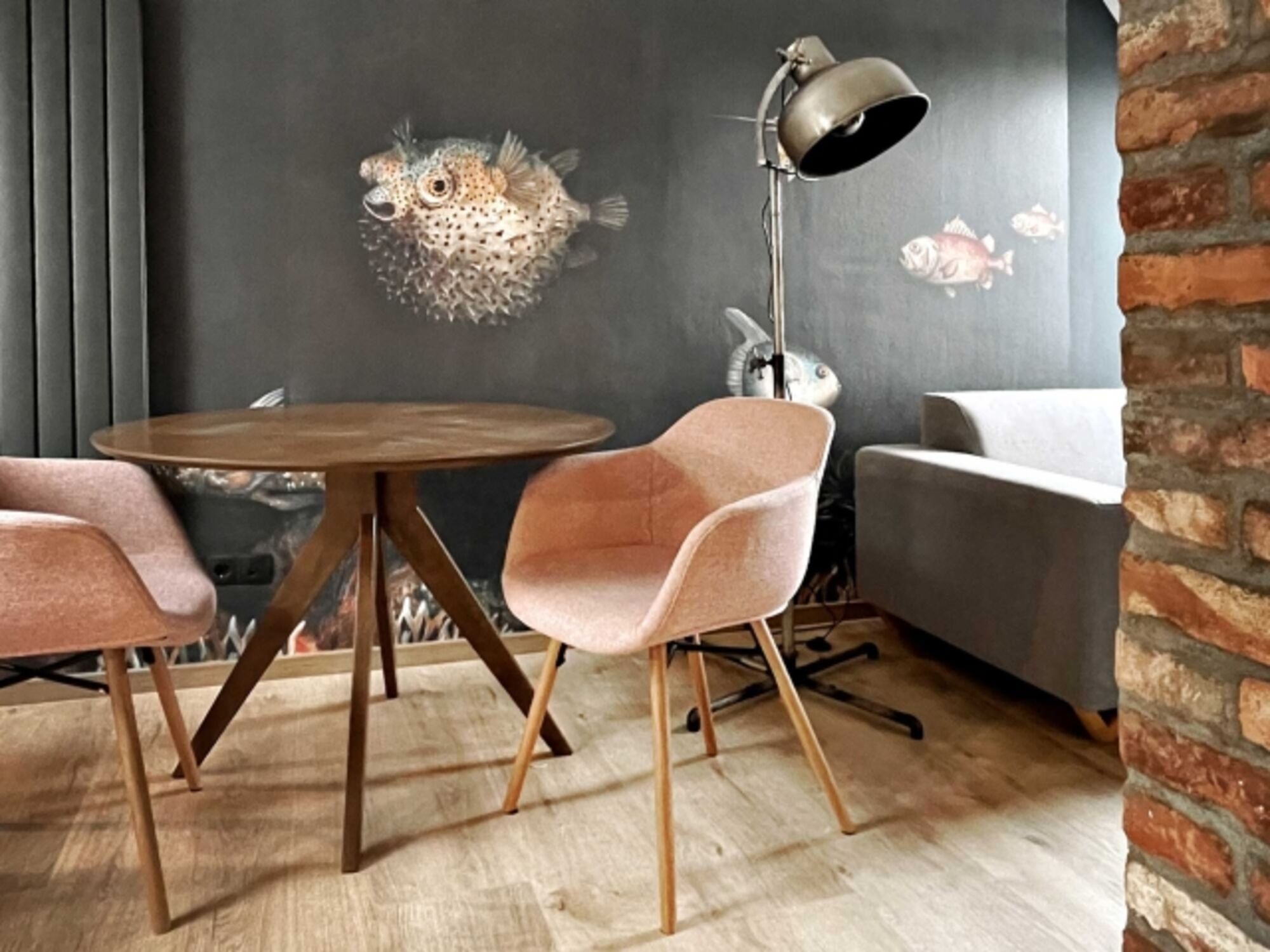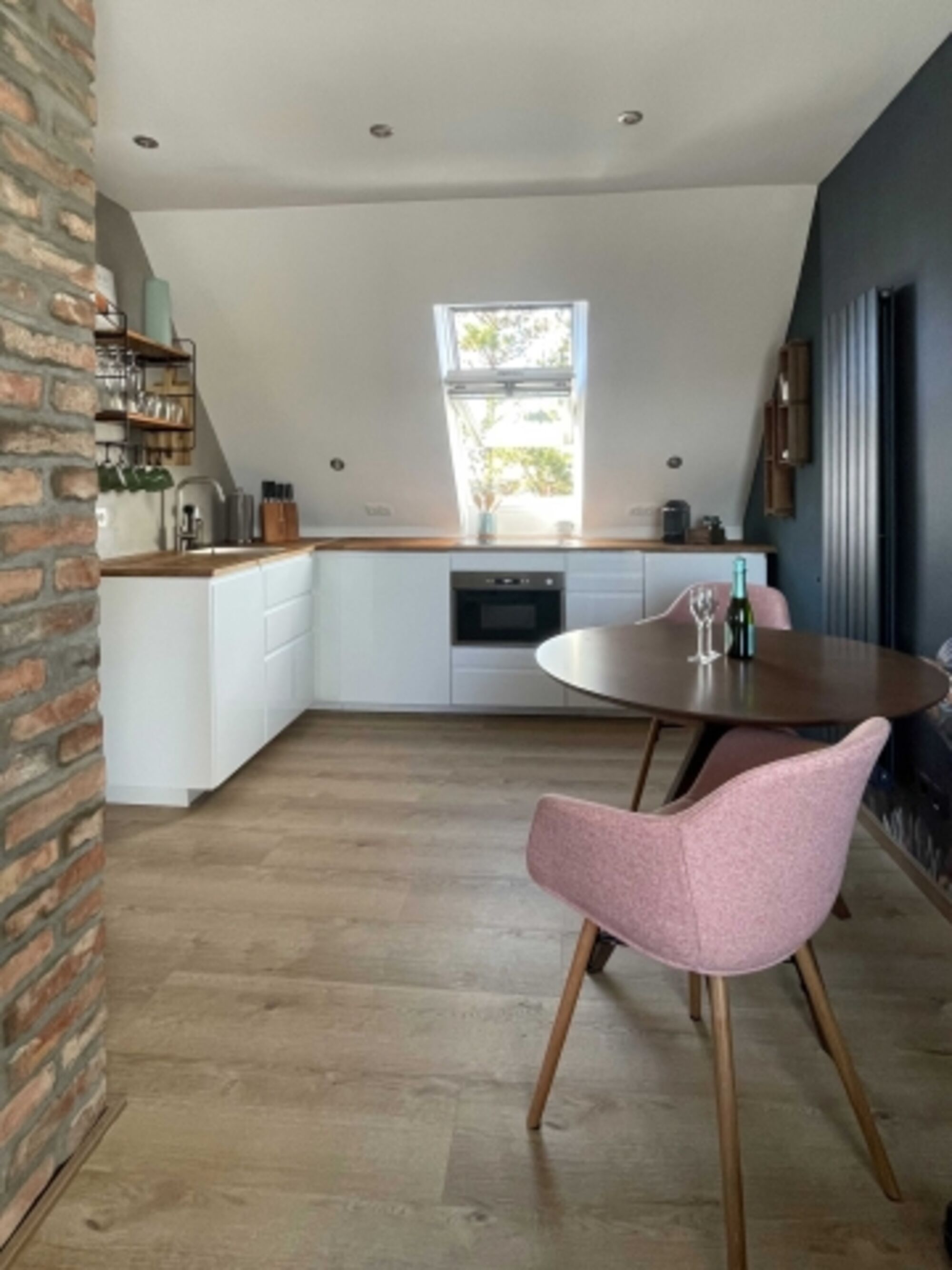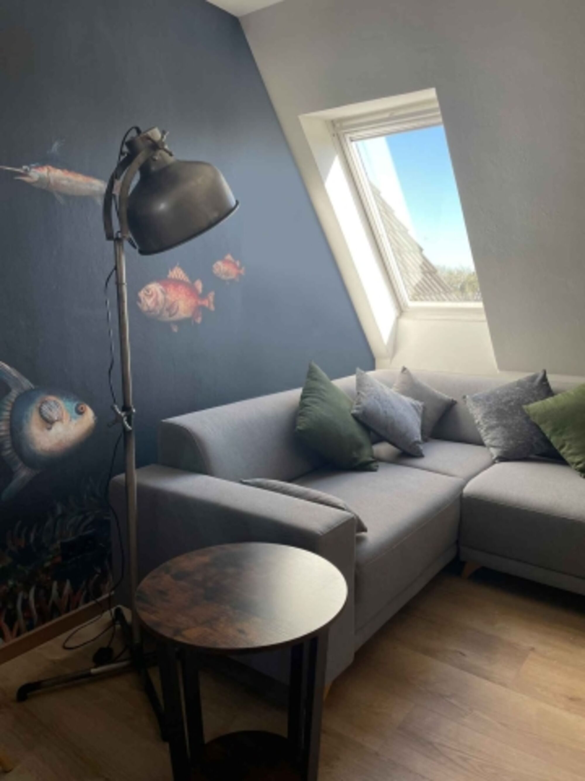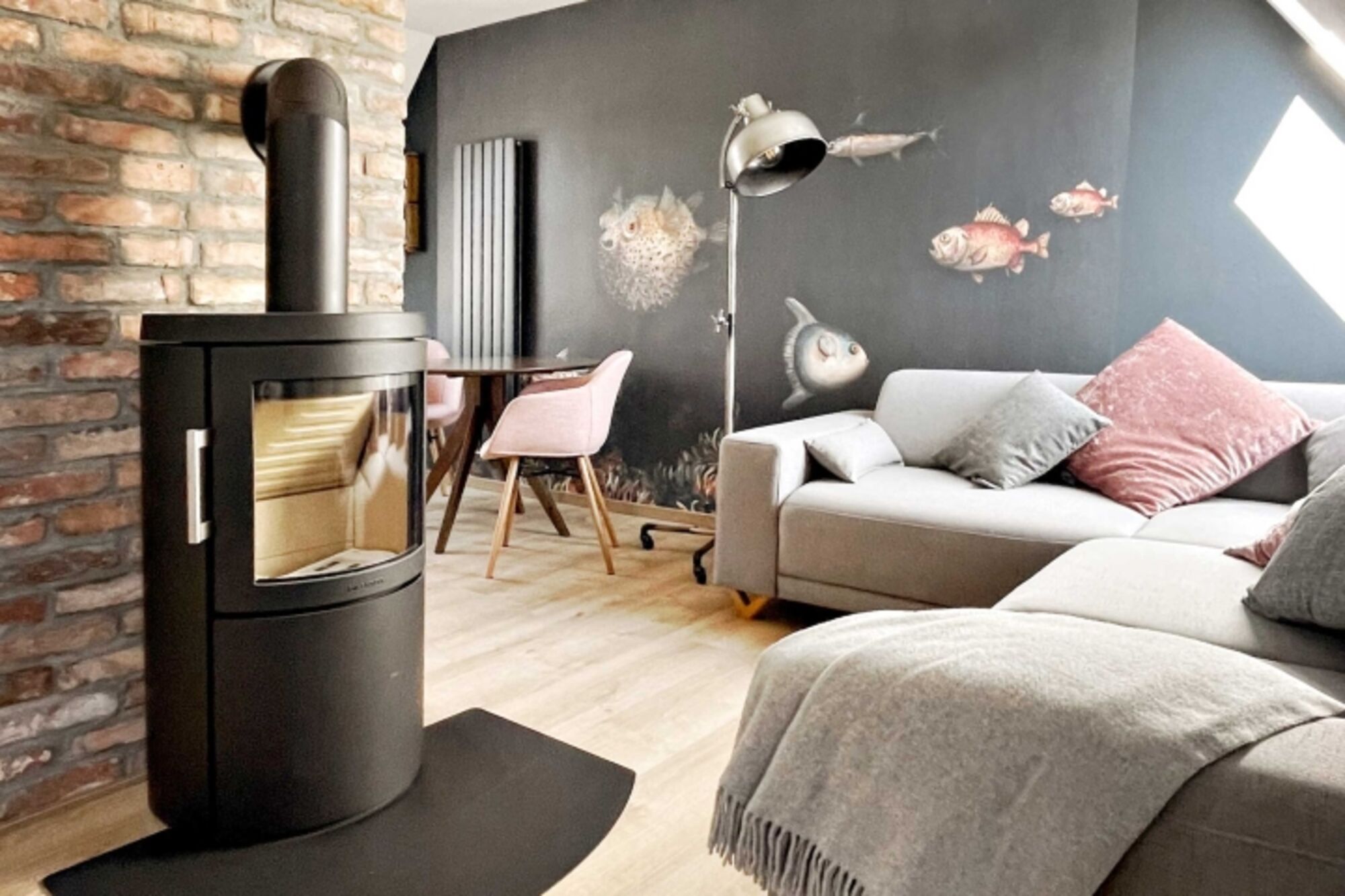 Ein großes Wandbild im Wohnbereich lässt uns eintauchen in eine wundersame Unterwasserwelt. Wer's mit Meeresbewohnern nicht so hat, kann von der gemütlichen und bequemen Eckcouch durch das Dachfenster die Wolken und Möwen vorbeiziehen sehen und gemütliche Stunden vor dem Kaminofen verbringen.