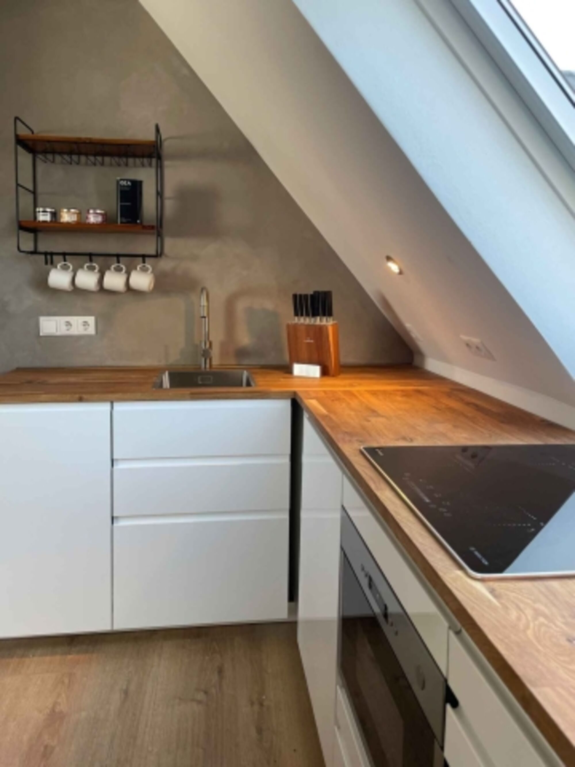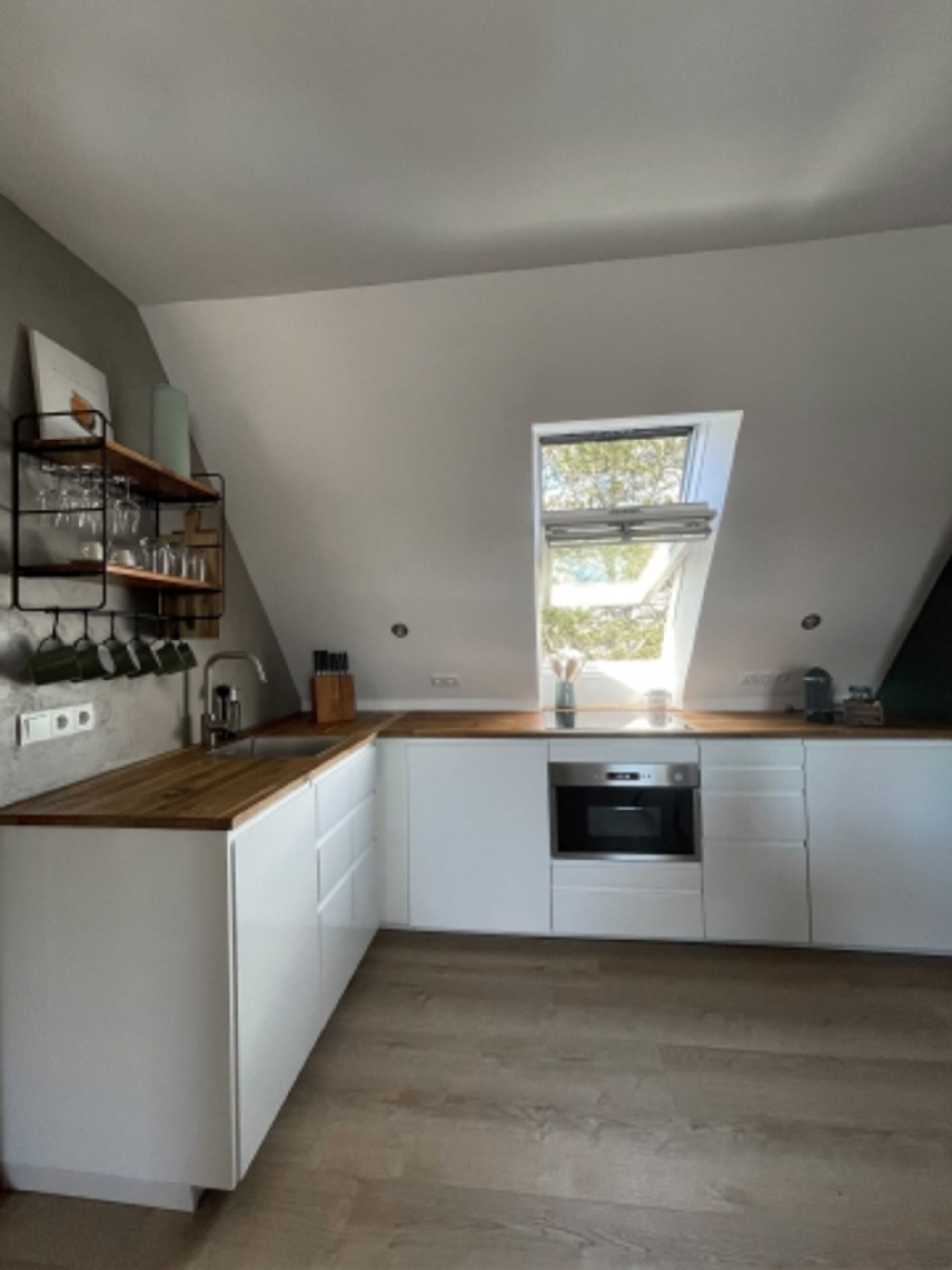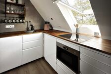 4-Platten Herd, Induktionsherd, Kühlschrank mit Gefrierfach, Nespresso-Automat, Korkenzieher / Flaschenöffner, Gewürze (Salz, Pfeffer, Zucker), Geschirrhandtücher, Mülltüten, Essplatz in der Küche