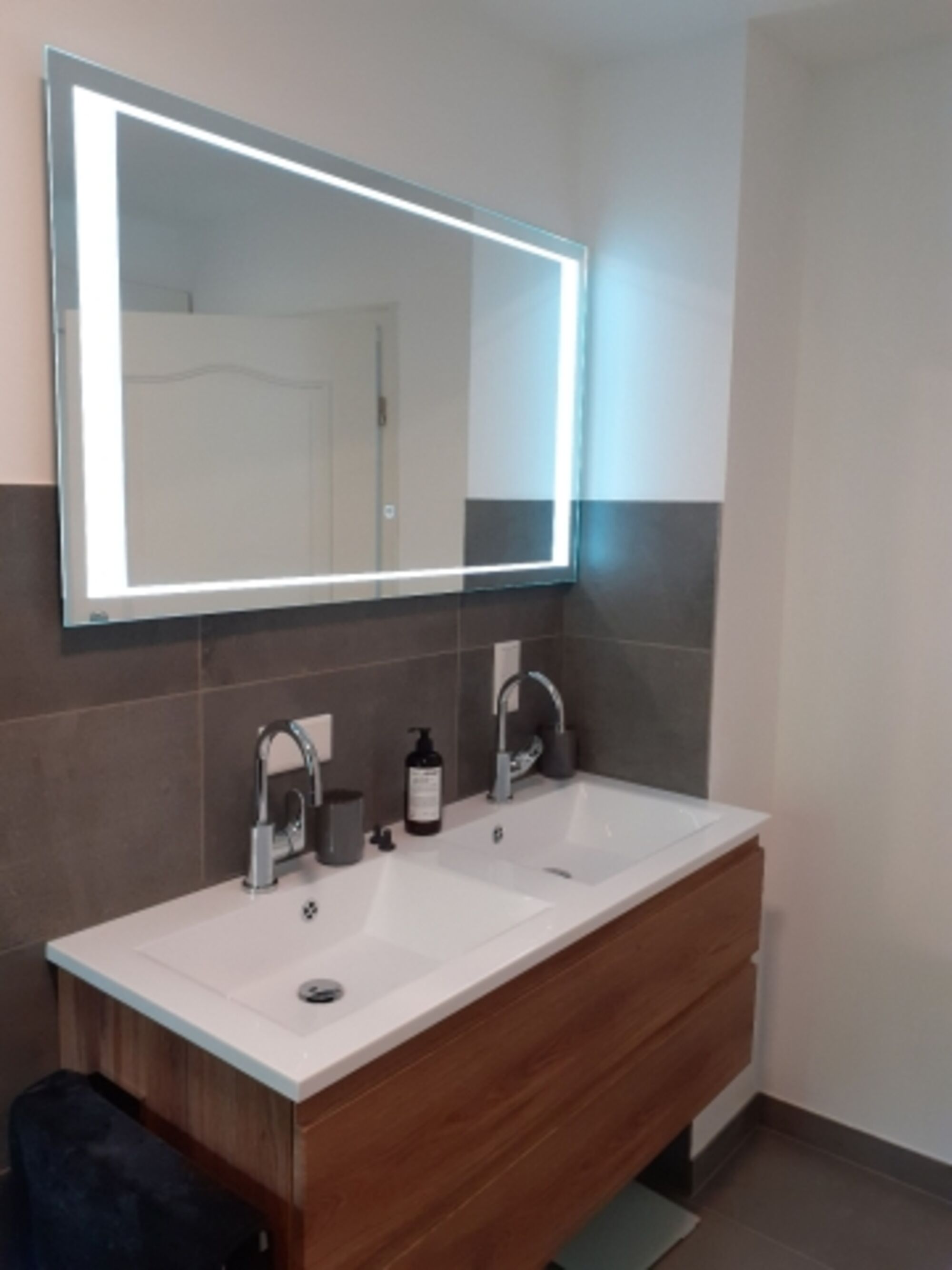 Doppelwaschbecken, Regendusche, Spiegel, Fenster im Bad