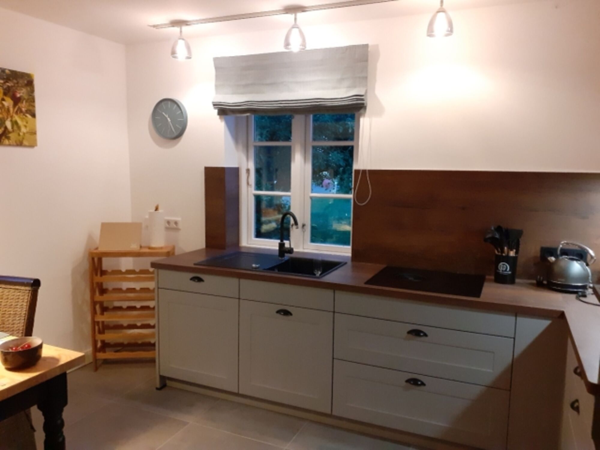 Induktionsherd, Kühlschrank mit Gefrierfach, Senseo-Kaffeeautomat, Mixer, Elekt. Fruchtpresse, Gewürze (Salz, Pfeffer, Zucker), Geschirrhandtücher, Mülltüten, Essplatz in der Küche