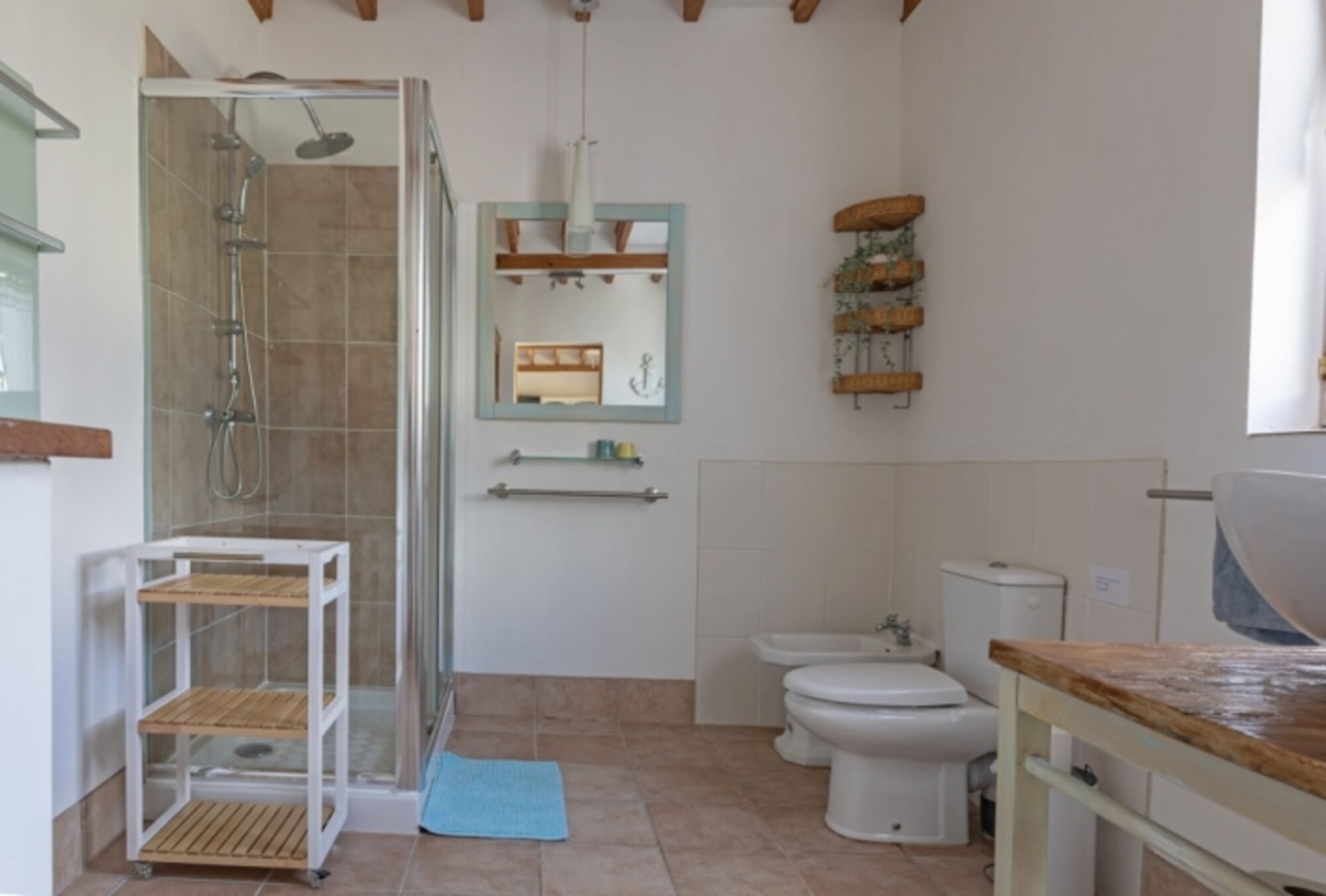 Waschbecken, Regendusche, Spiegel, Fenster im Bad, Bidet