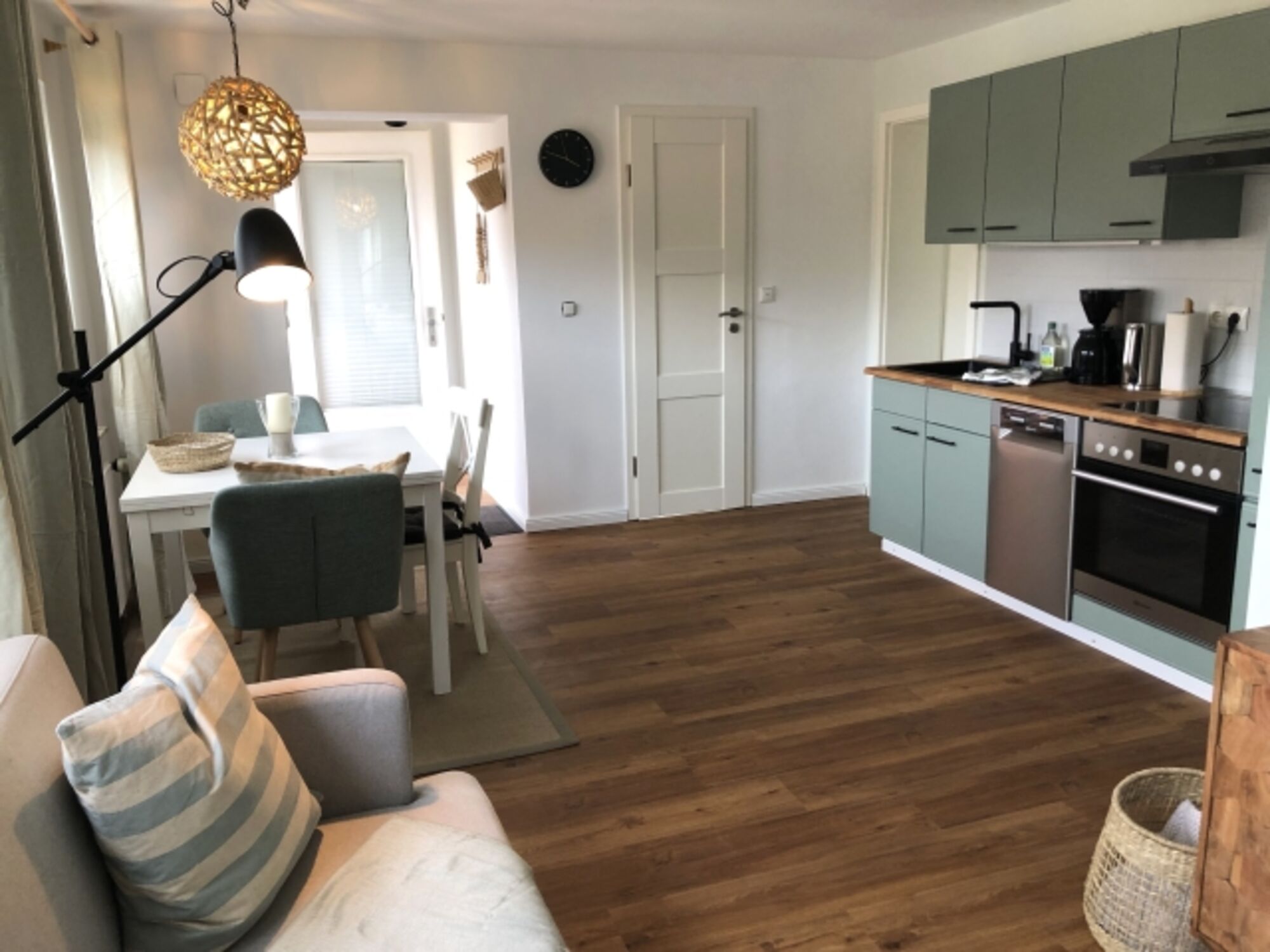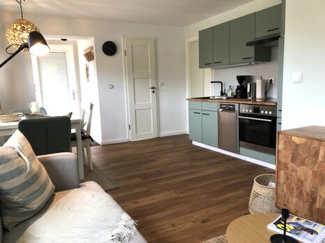 Die voll ausgestattete Küche lädt zum entspannten Kochen ein. Sie ist ausgestattet mit einem vier Herd Kochfeld, einem großem Kühlschrank, einem Backofen, einer Geschirrspülmaschine, Kaffeemaschine, Wasserkocher und einem Toaster.