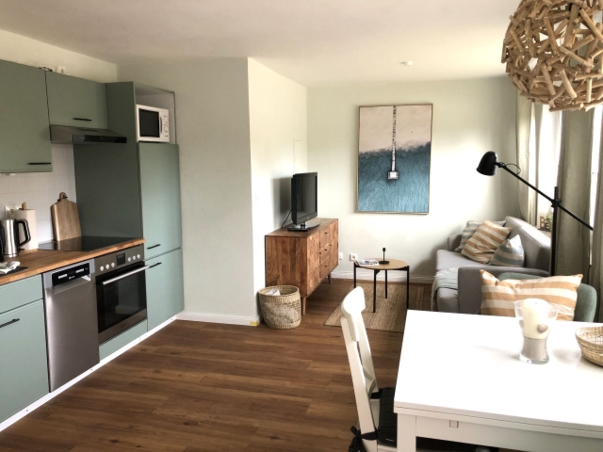Das lichtdurchflutete Wohnzimmer ist der zentrale Mittelpunkt der Wohnung. Hier gibt es einen Esstisch mit 2 Stühlen, eine gemütliche Sitzecke, einen Fernseher und die offene Küche.
