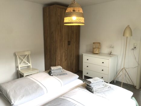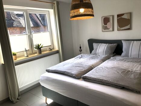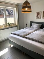 Das Schlafzimmer ist ausgestattet mit einem 180 cm x 200 cm Boxspringbett und einer Kommode und einem Kleiderschrank mit Bügeln. Hier lässt es sich dank der ruhigen Lage zum Garten raus ruhig und entspannt schlafen.
