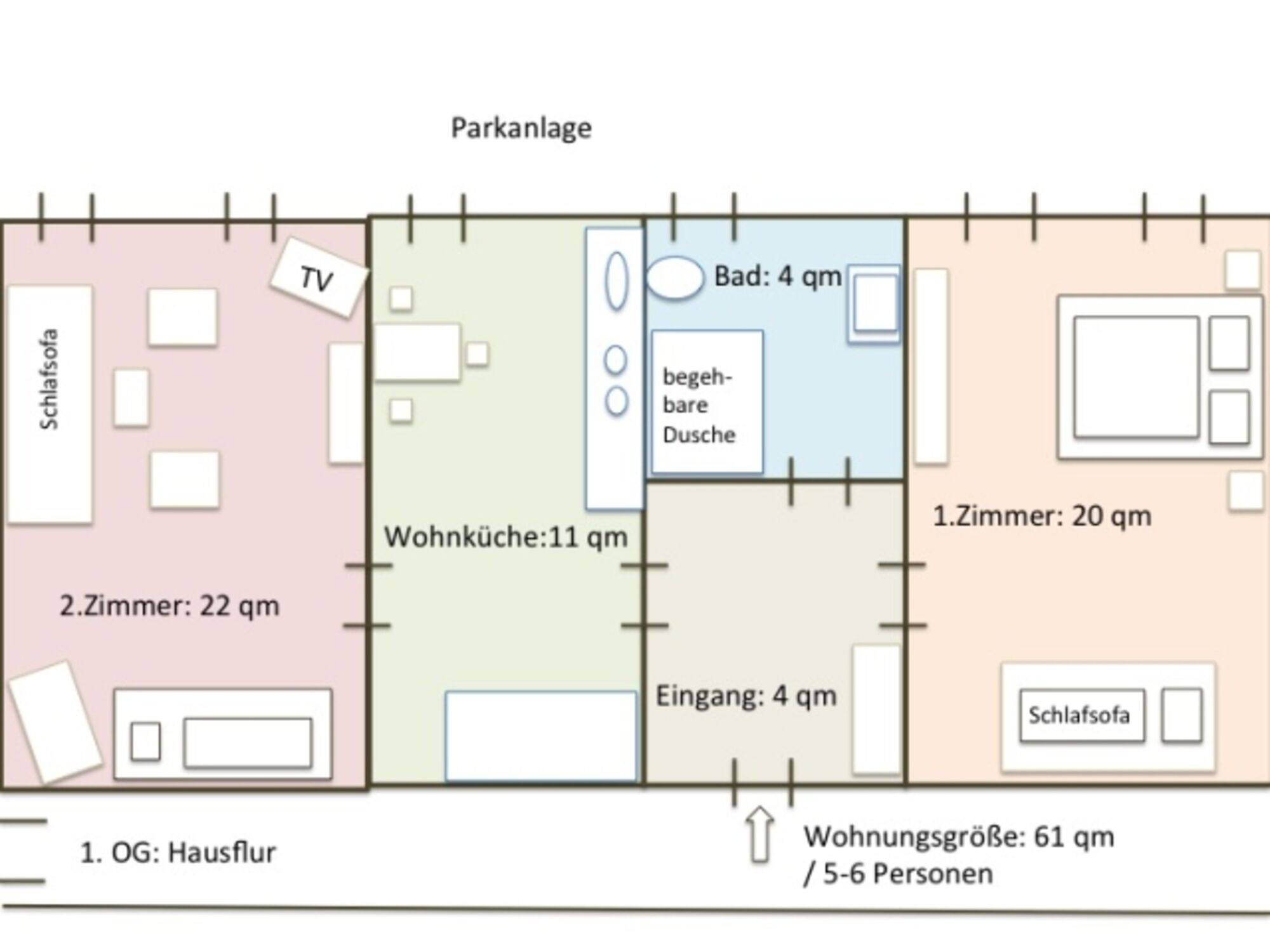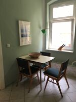 Ausstattung: Handtücher, Bettwäsche, Badevorleger, Geschirrhandtücher werden gestellt. TV, W-lan, Schreibtisch, Sofa, Sessel, Spiegel, Schrank, Regale, Heizung, Hänger sind vorhanden.