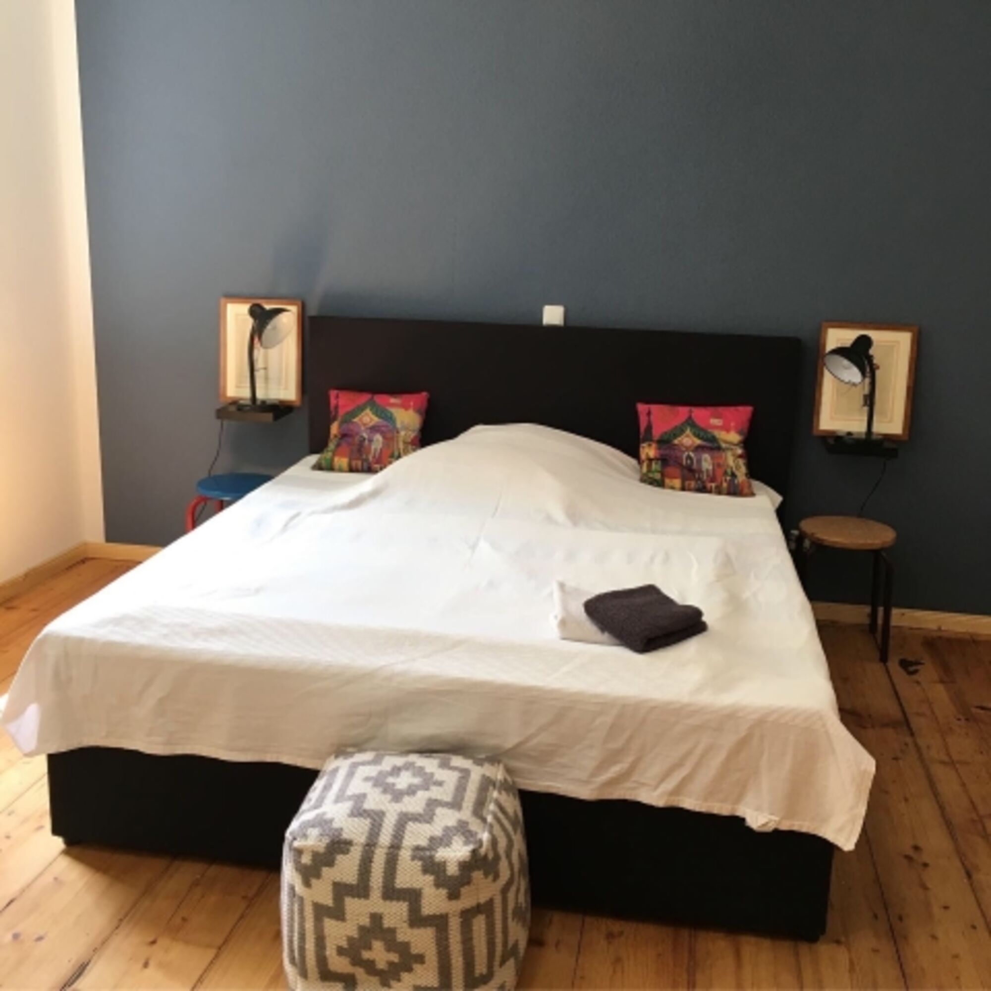 HIer kann auch ein Baby im Babybett oder ein Kleinkind im Reisebett oder auf der Schlafcouch schlafen Doppelbett 1,80 x 2,00m, Boxspringbett, Spiegel, Leselampe am Bett, Fliegengitter