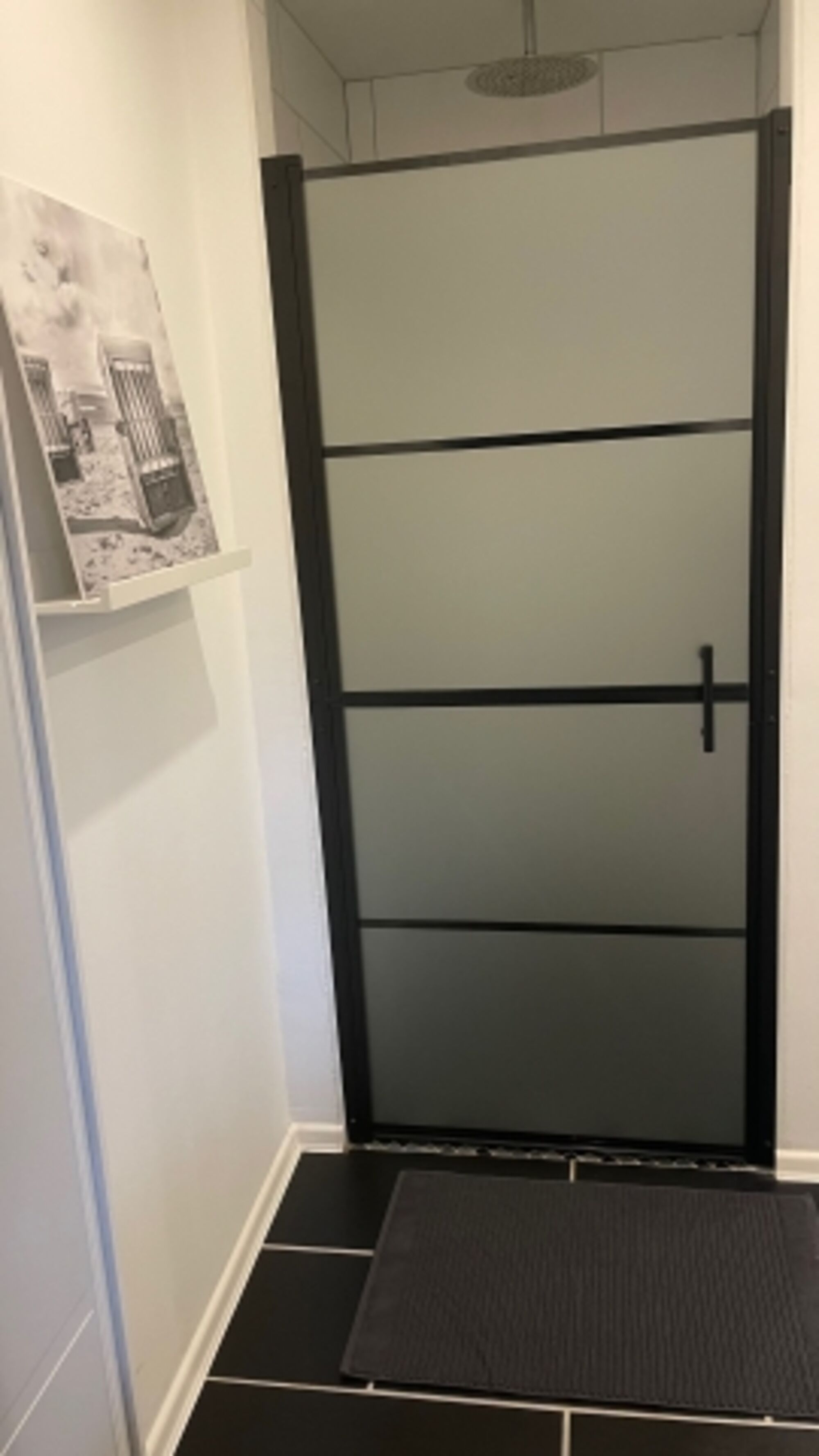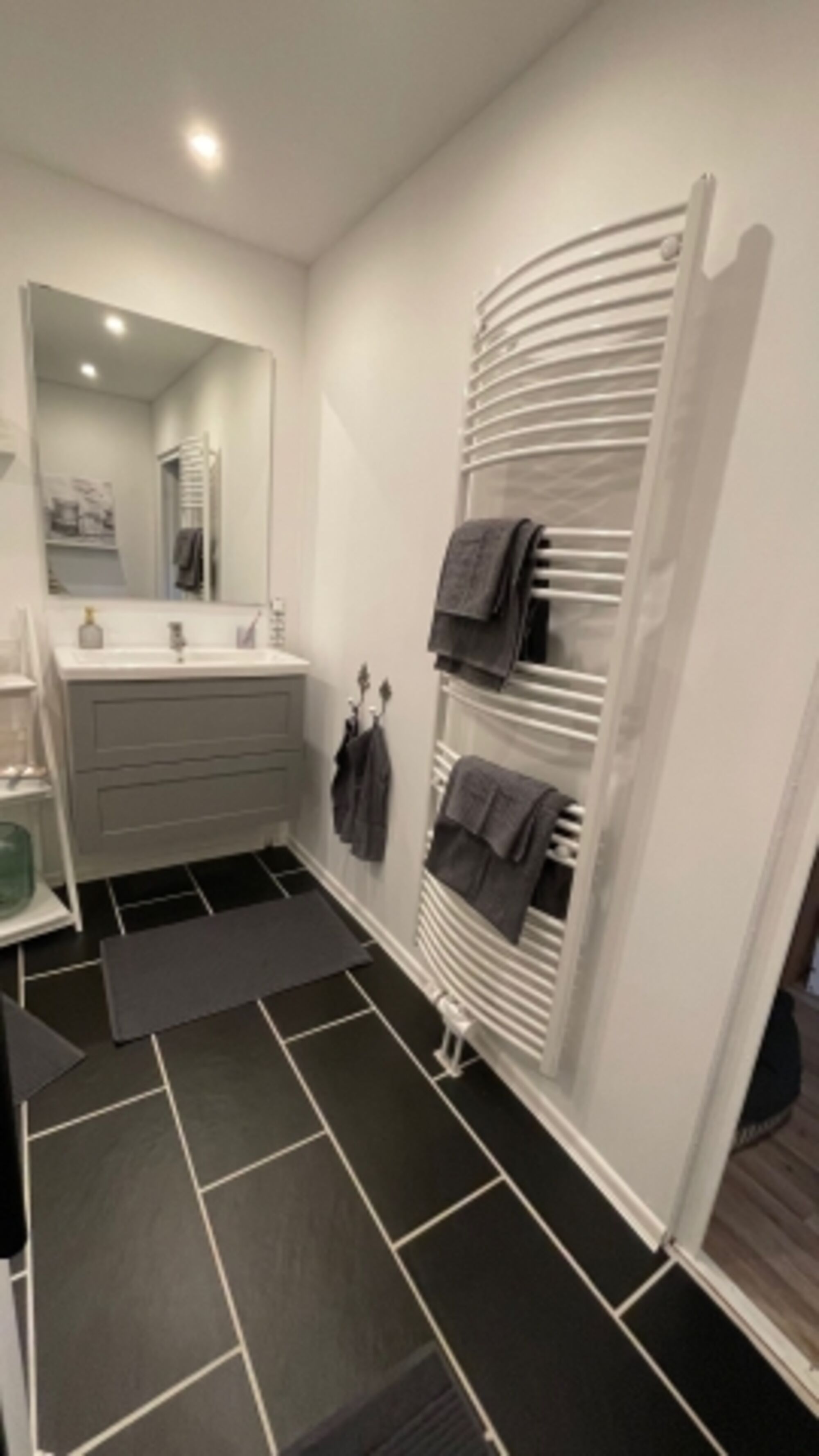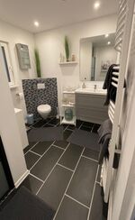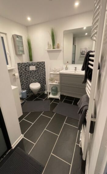 Das Bad hat neben der angenehmen Fußbodenheizung eine ca. 1,5 m² große Regendusche & dazu einen Handtuchheizkörper.