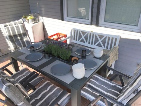 Auf der sichtgeschützten Terrasse ist eine Sitzecke zum Relaxen, grillen oder einfach gemütlichem Beisammensein!
