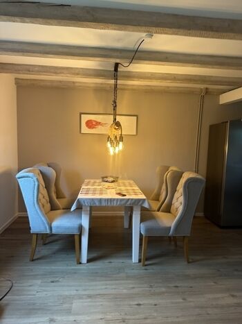 Cerankochfeld, Dunstabzugshaube, Kühlschrank mit Gefrierfach, Nespresso-Automat, Mixer, Korkenzieher / Flaschenöffner, Gewürze (Salz, Pfeffer, Zucker), Öl / Essig, Geschirrhandtücher, Mülltüten, Essplatz in der Küche