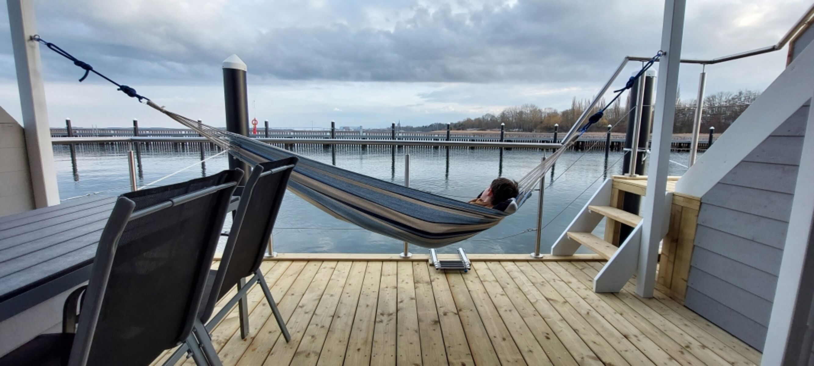 Unser Hausboot verfügt über eine Terrasse im Erdgeschoss mit einem Essplatz für fünf Personen. Weiterhin besteht dort die Möglichkeit, die vorhandene Hängematte einzuhängen. Von dieser Terrasse gelangt man über eine Treppe zu der ca. 40qm großen Dachterrasse mit Loungeecke und Sonnenliegen. Hier können Sie einen wundervollen Ausblick genießen. Die zertifizierte Bio-Kläranlage trägt zu einer umweltgerechten Entsorgung des Abwassers bei.