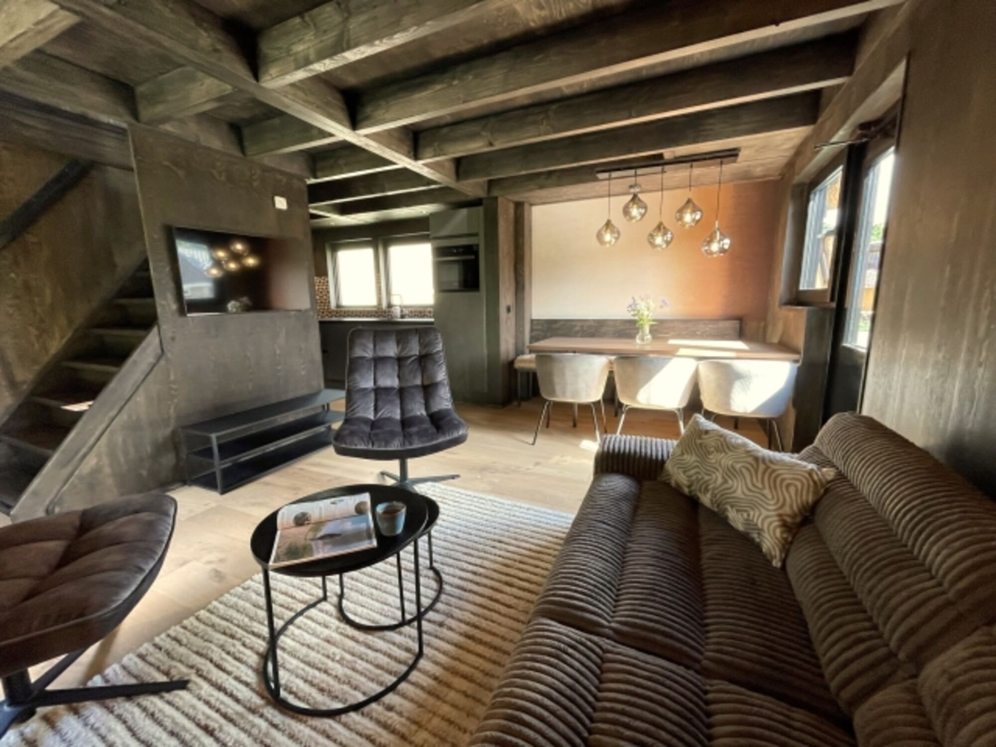 Das gemütliche Wohnzimmer ist stilvoll eingerichtet und bietet eine bequeme Sitzecke, einen Smart-TV und einen schönen Esstisch. Die offene Küche ist komplett ausgestattet mit modernen Annehmlichkeiten wie einem Induktionsherd, einer Spülmaschine, einem großen Kühlschrank und einer Kaffeemaschine.