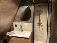 Im Obergeschoss befinden sich die beiden anderen Schlafzimmer mit einem gemeinsamen Bad. Ein Schlafzimmer ist mit einem komfortablen Boxspring-Doppelbett ausgestattet, während das zweite Schlafzimmer zwei Boxspring-Einzelbetten bietet. Das luxuriöse Badezimmer verfügt über Waschbecken, WC und eine verlockende Regendusche.