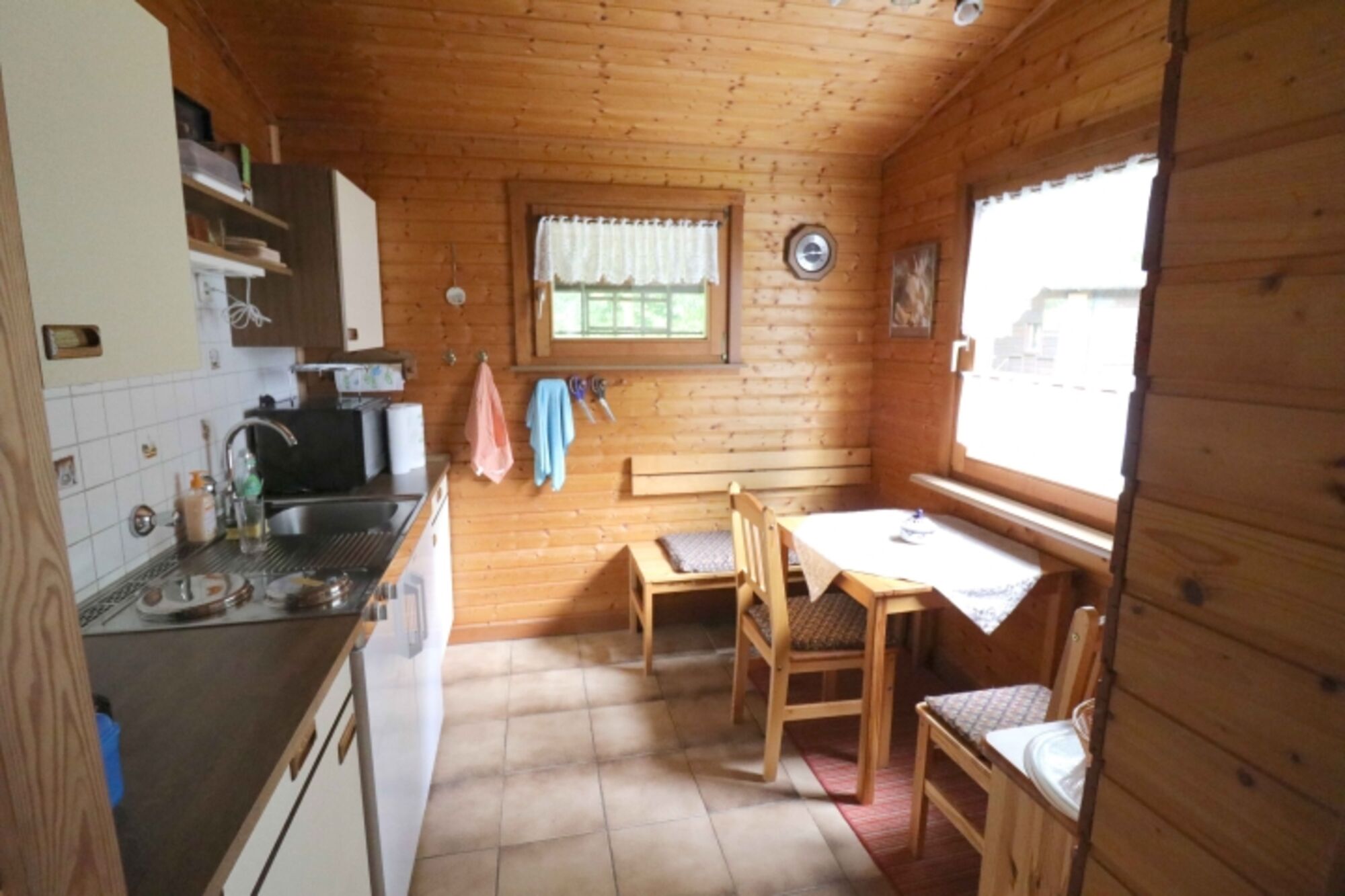 2-Platten Herd, Korkenzieher / Flaschenöffner, Gewürze (Salz, Pfeffer, Zucker), Geschirrhandtücher, Mülltüten, Essplatz in der Küche