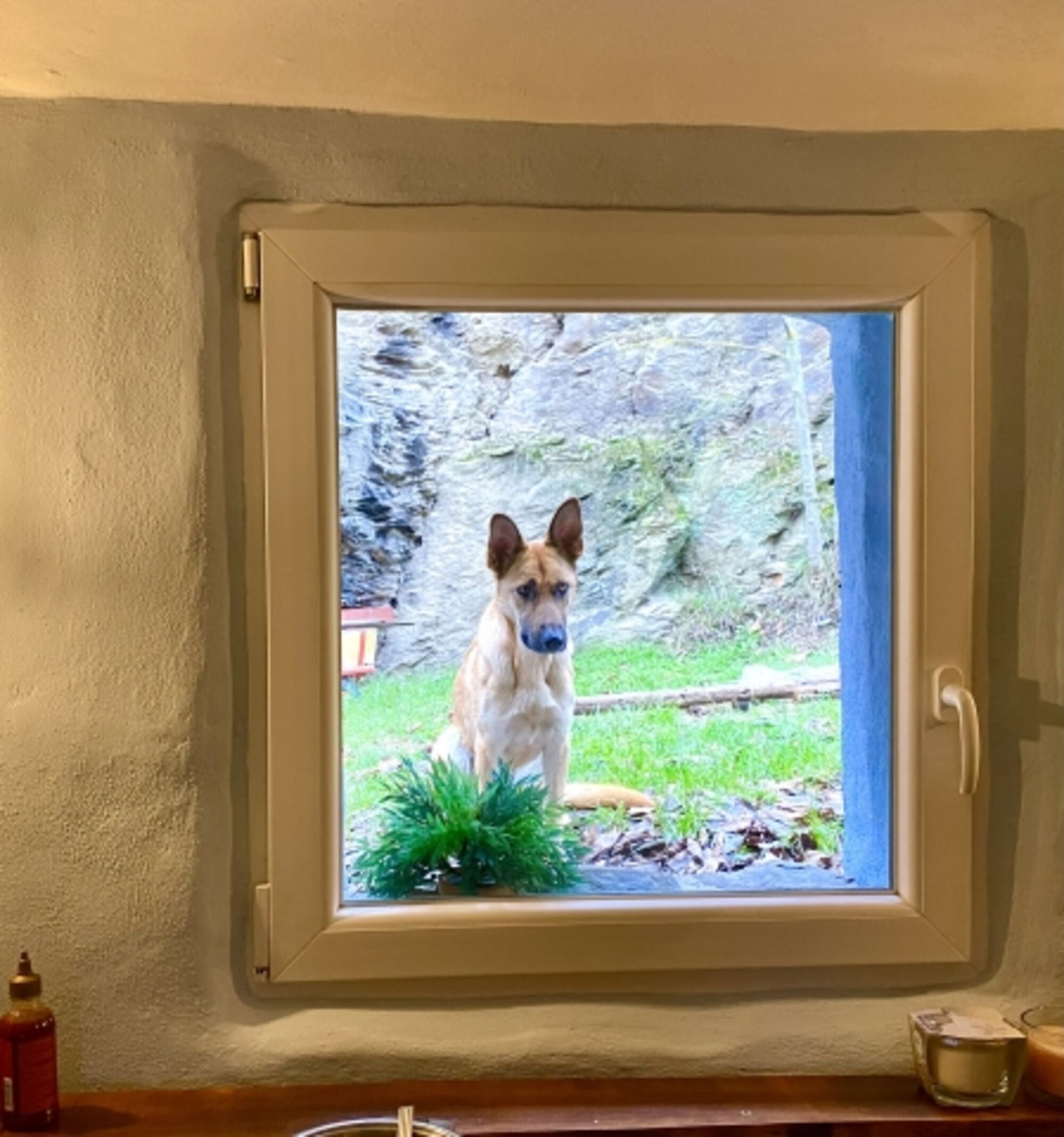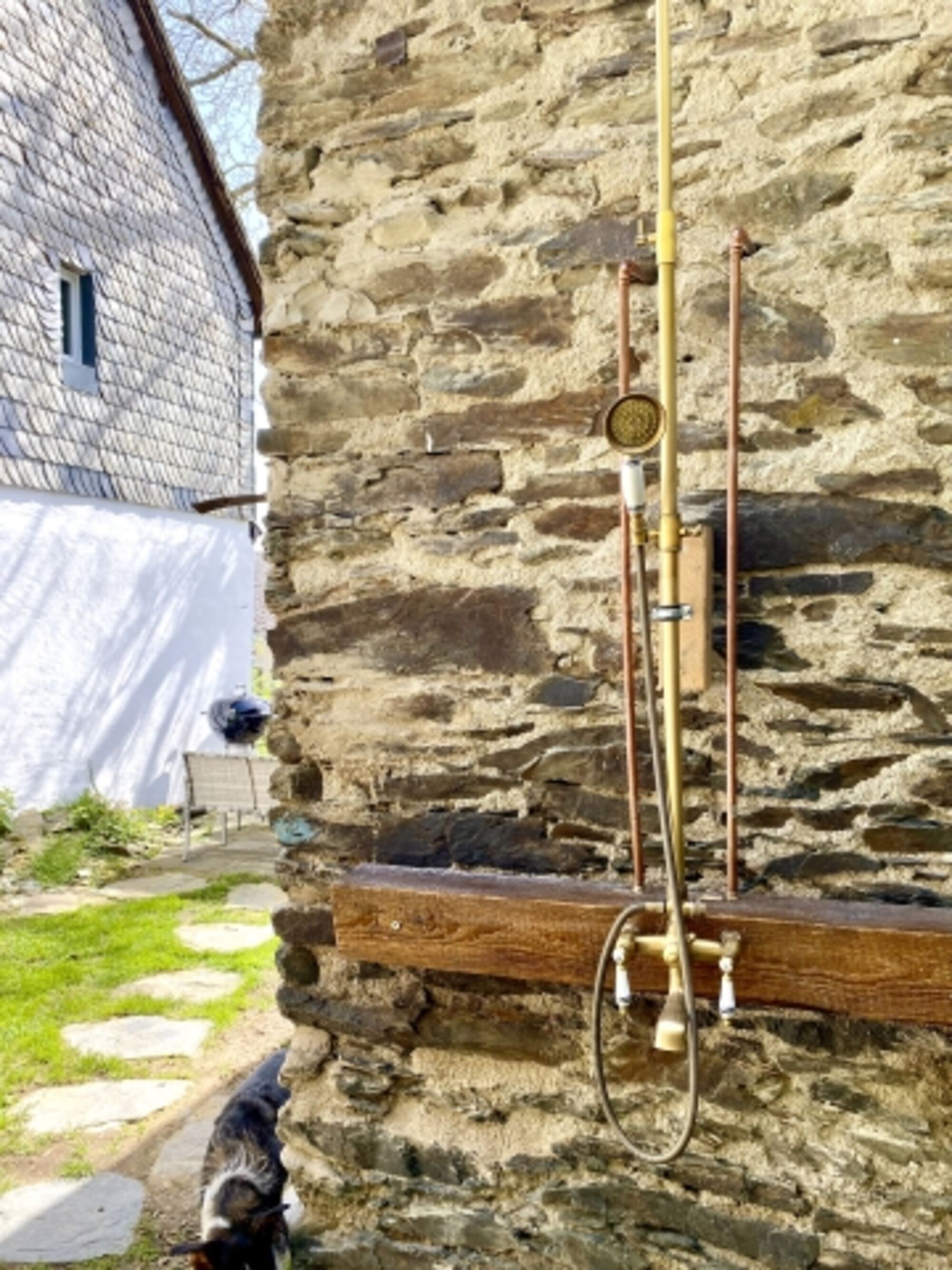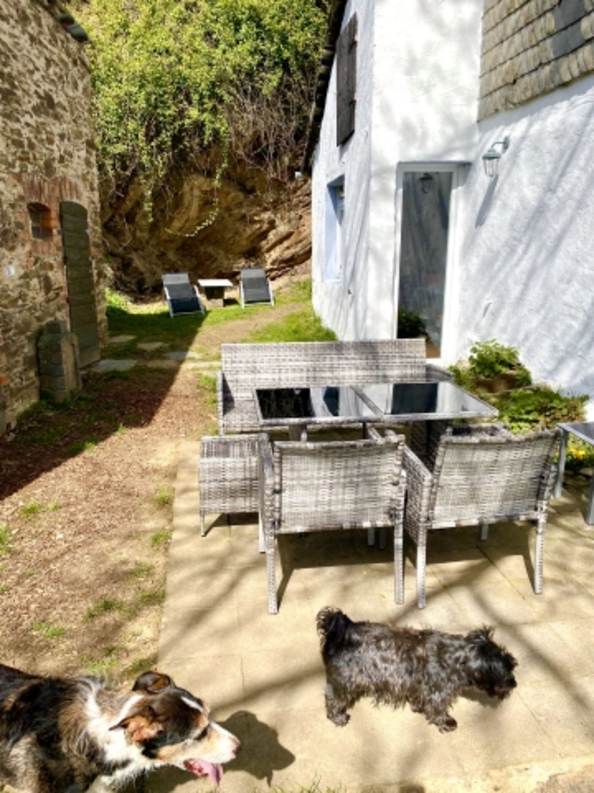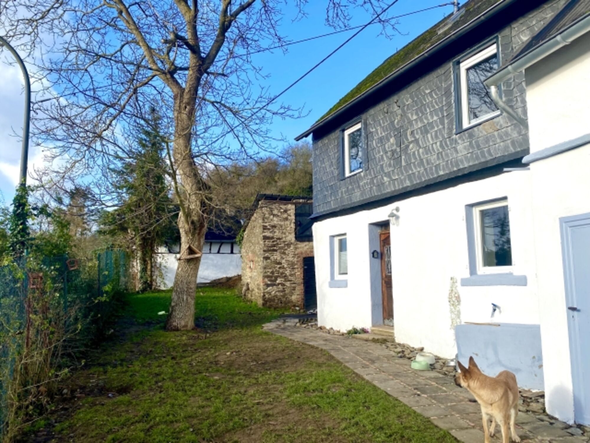 Der 400 qm große Garten ist 1,80m eingezäunt. Das alte Bauernhaus liegt urig am Rande eines hohen Schieferfelsens im Schieferland Kaisersesch.