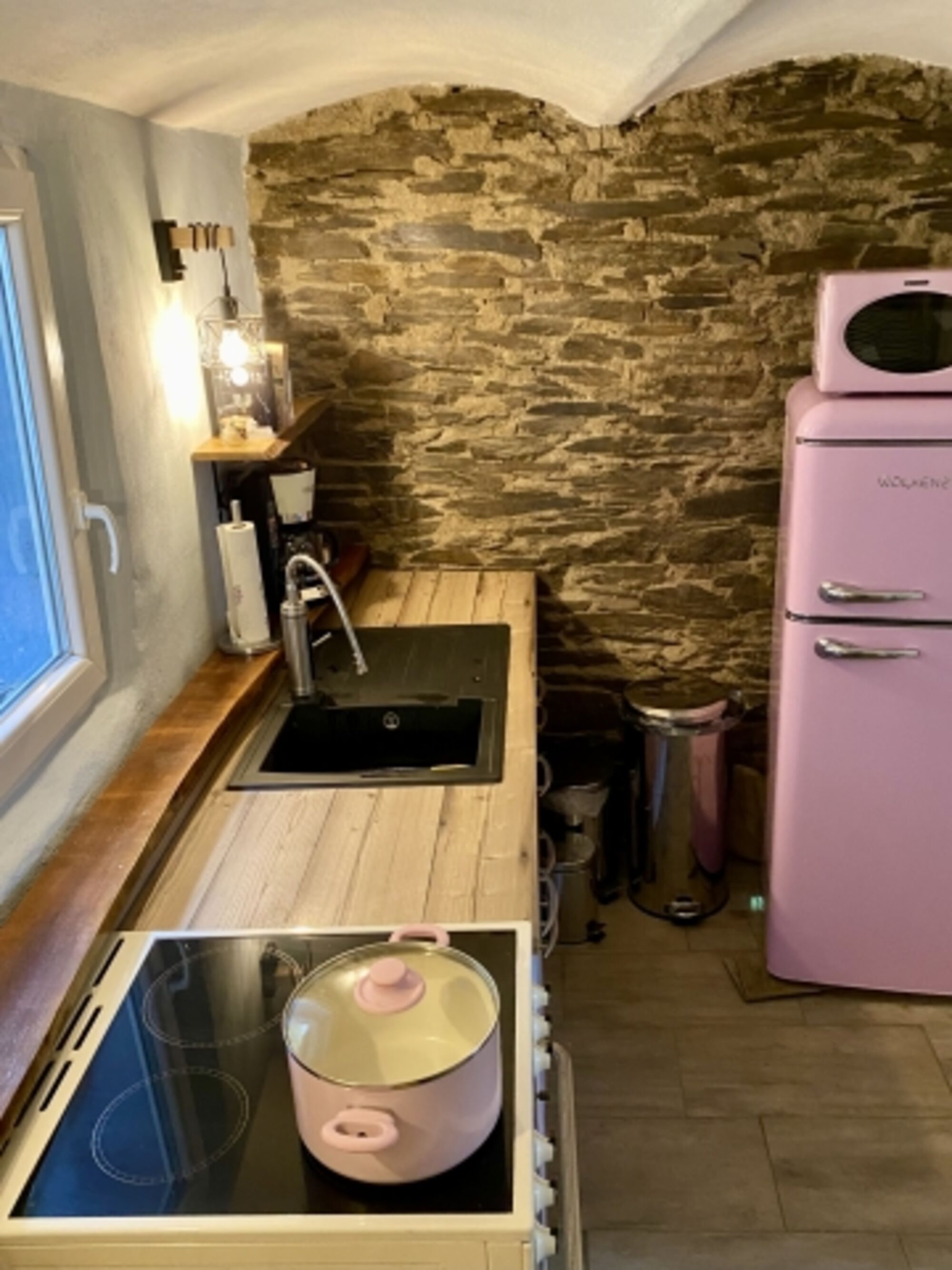 Cerankochfeld, Kühlschrank mit Gefrierfach, Senseo-Kaffeeautomat, Korkenzieher / Flaschenöffner, Gewürze (Salz, Pfeffer, Zucker), Öl / Essig, Geschirrhandtücher, Mülltüten
