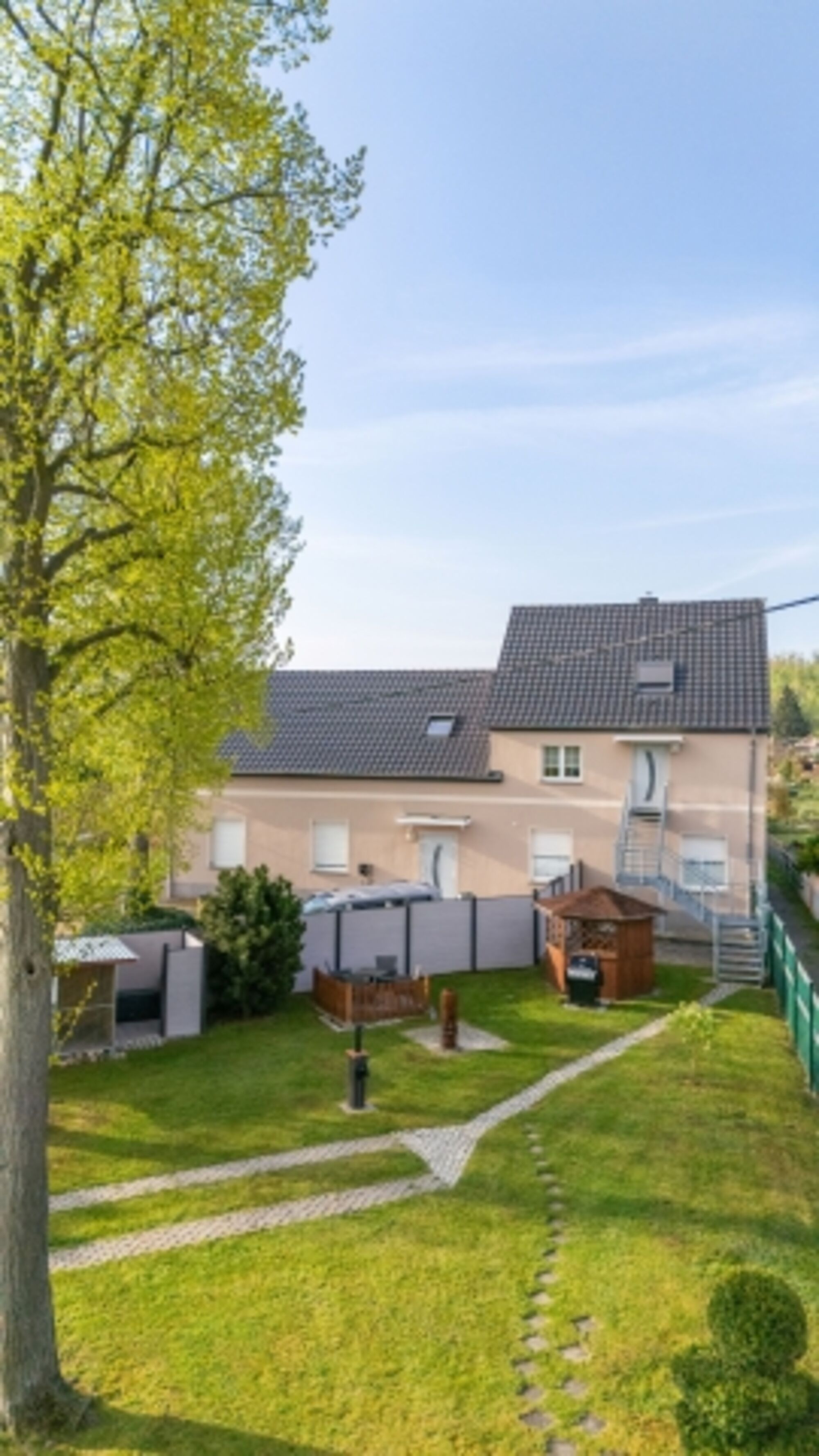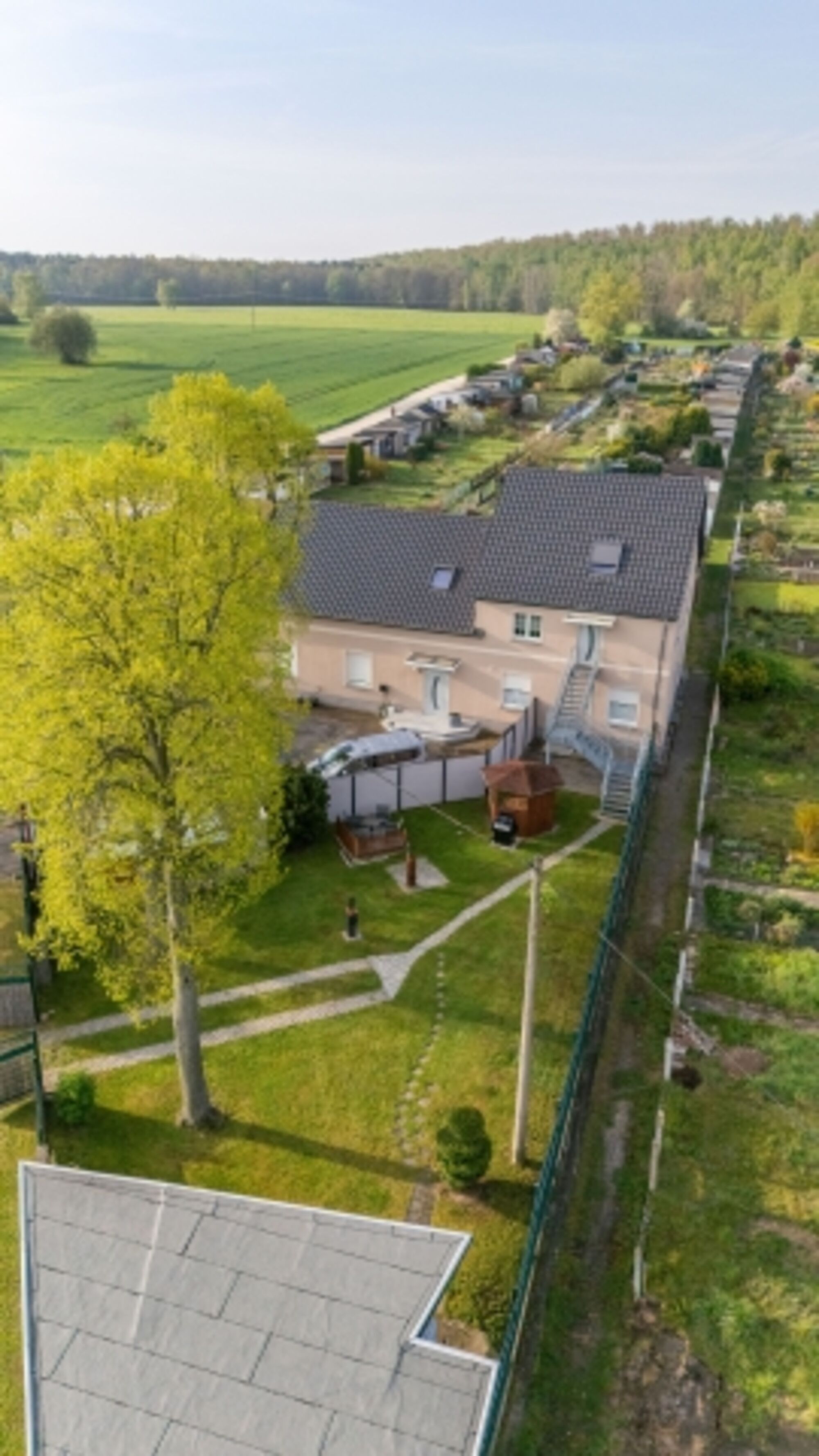 In direkter Nachbarschaft befindet sich eine Gartenanlage und nach 100 m Feldweg kommt man in ein Waldgebiet, welches zu Kilometer langen Spaziergängen einlädt. Einkaufsmöglichkeiten aller Art befinden sich direkt im Ort.