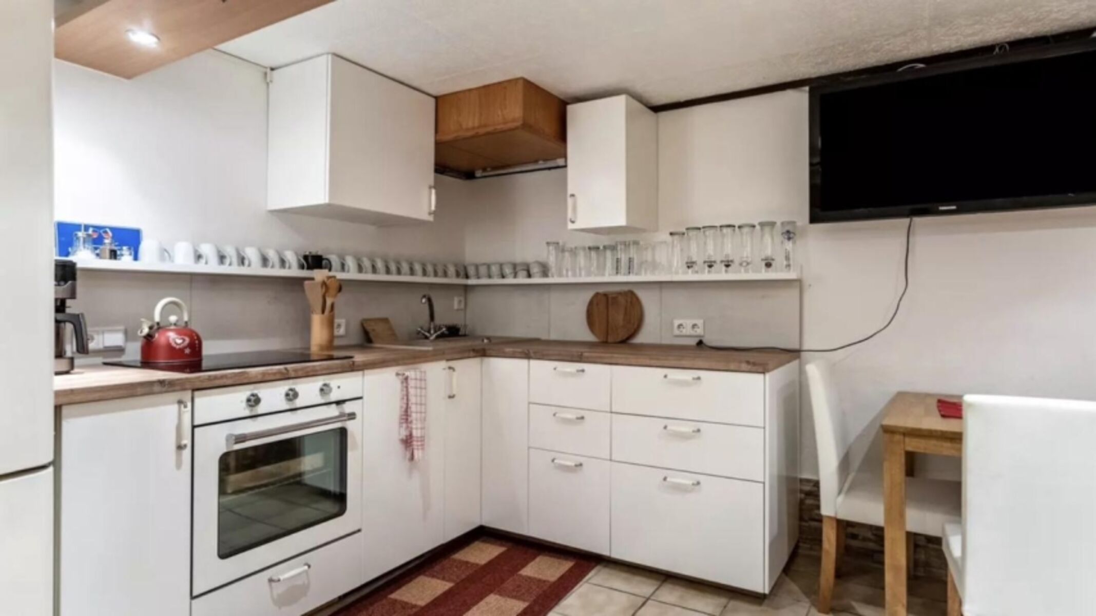 2-Platten Herd, Cerankochfeld, Dunstabzugshaube, Kühlschrank mit Gefrierfach, Gefrierschrank, Korkenzieher / Flaschenöffner, Gewürze (Salz, Pfeffer, Zucker), Geschirrhandtücher, Mülltüten, Essplatz in der Küche