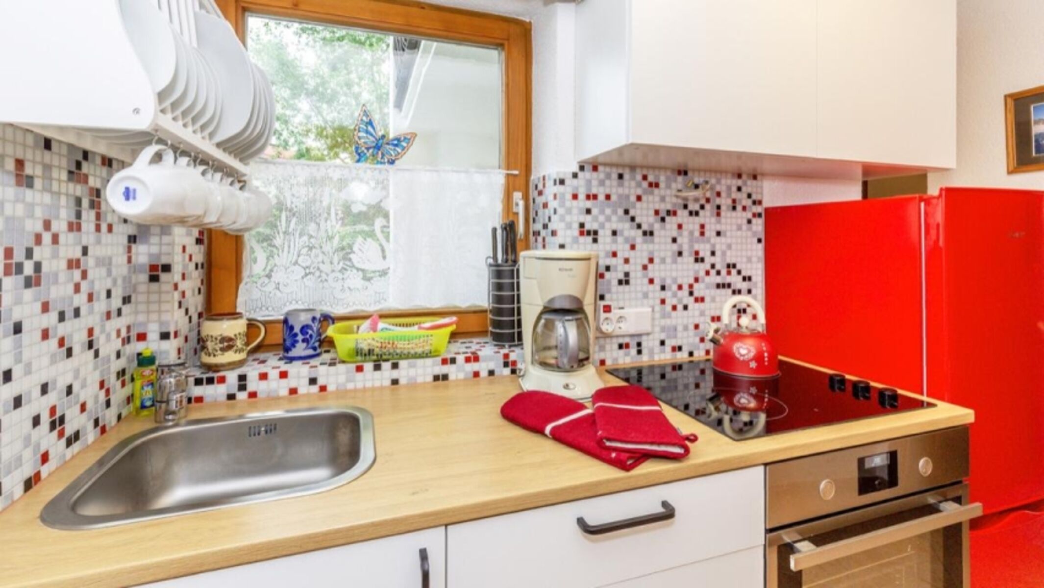 4-Platten Herd, Cerankochfeld, Dunstabzugshaube, Kühlschrank mit Gefrierfach, Gefrierschrank, Eierkocher, Korkenzieher / Flaschenöffner, Gewürze (Salz, Pfeffer, Zucker), Geschirrhandtücher, Mülltüten