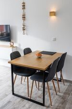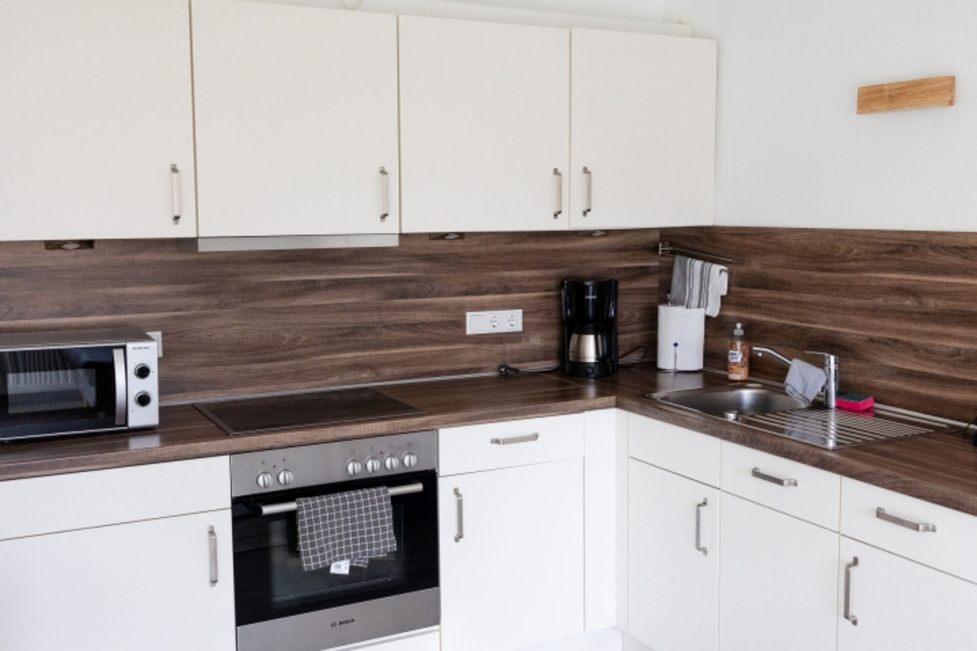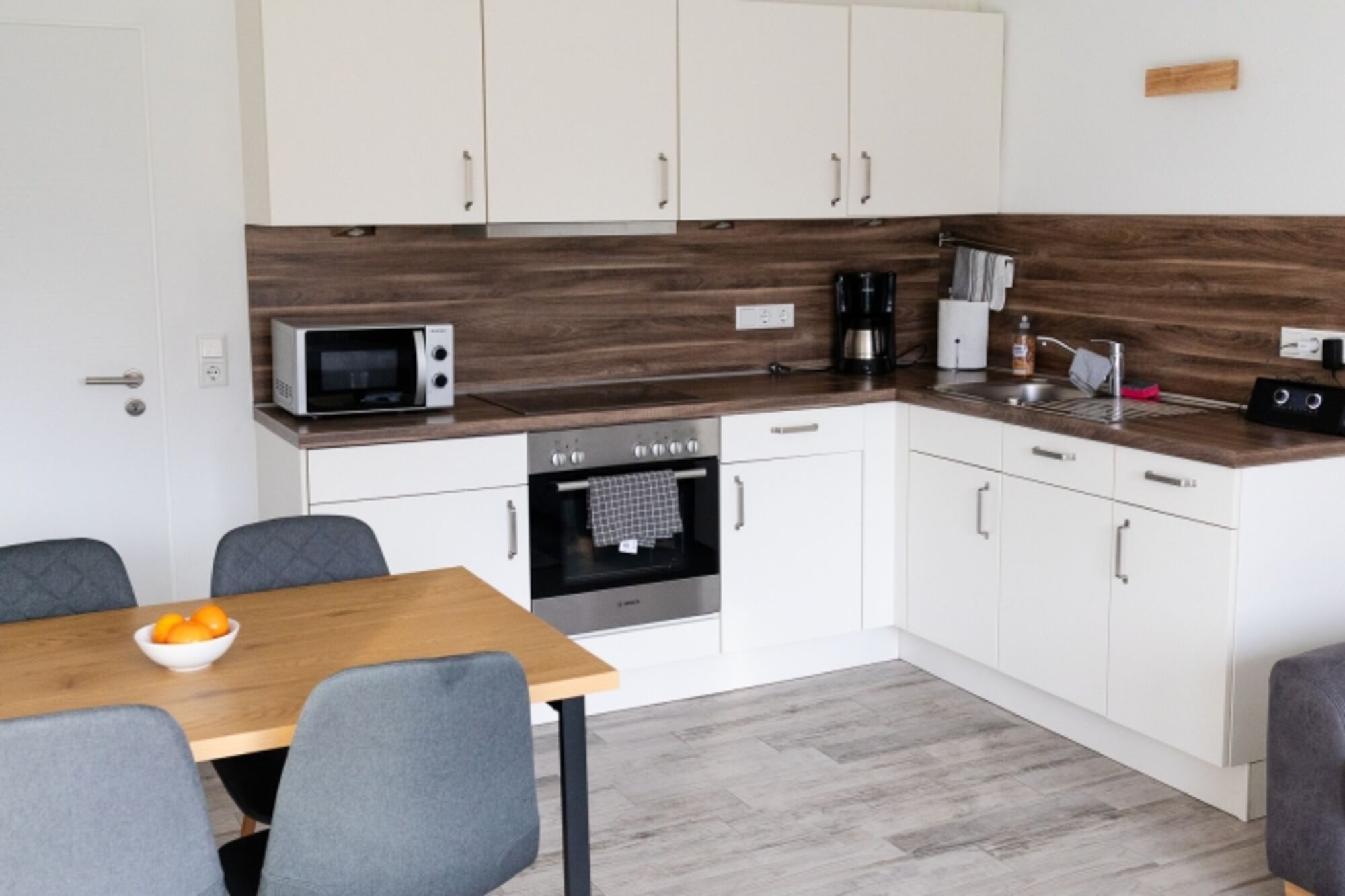 Die Wohnung verfügt über ein helles und freundliches Wohnzimmer mit gemütlicher Sitzecke und einem Flachbildfernseher. Die offene Küche ist komplett ausgestattet und lädt zum gemeinsamen Kochen ein. Ein Esstisch bietet Platz für 4 Personen.