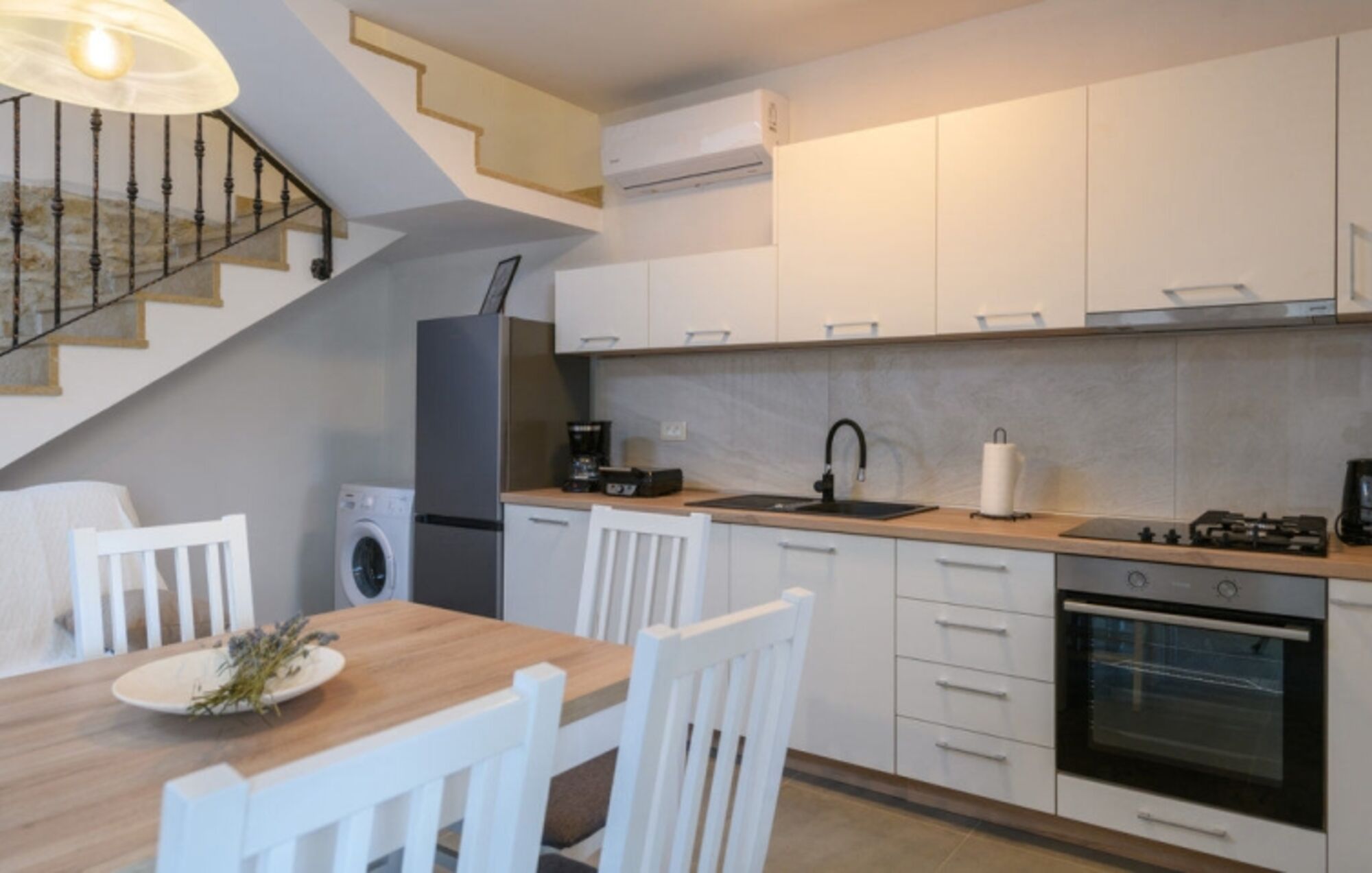 Induktionsherd, Dunstabzugshaube, Kühlschrank mit Gefrierfach, Geschirrhandtücher, Mülltüten, Essplatz in der Küche