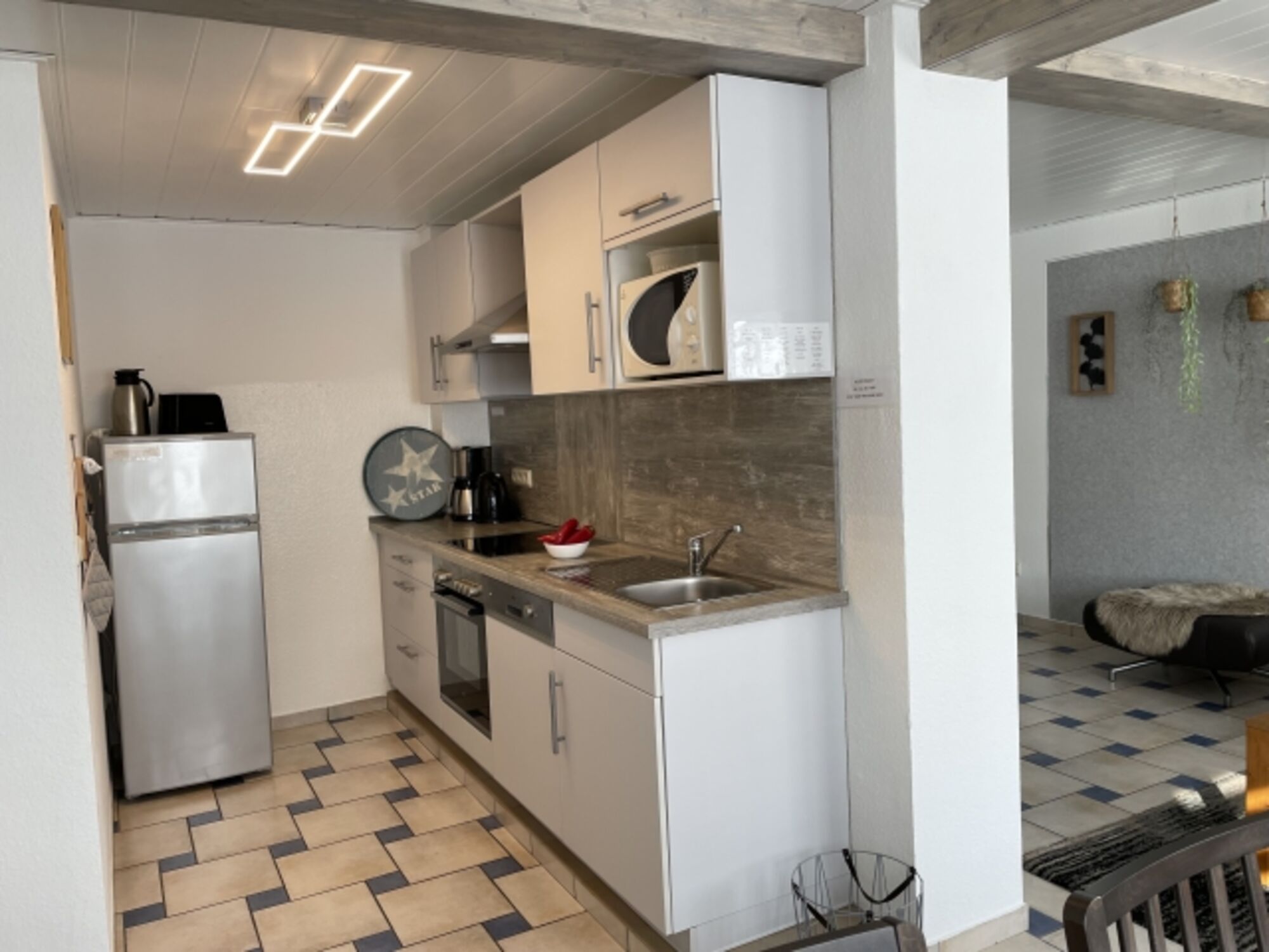 Cerankochfeld, Dunstabzugshaube, Kühlschrank mit Gefrierfach, Mixer, Korkenzieher / Flaschenöffner, Gewürze (Salz, Pfeffer, Zucker), Essplatz in der Küche