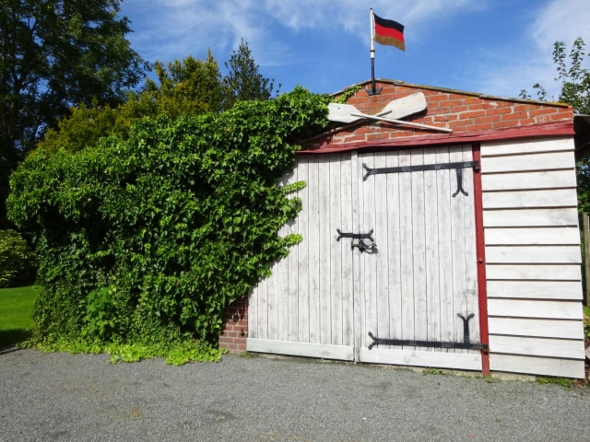 Draußen lädt eine große überdachte Terrasse zum Verweilen ein, diese ist nur ein paar Meter ums Haus entfernt– ausgestattet mit Grill und genügend Sitzgelegenheiten.
