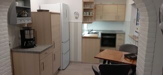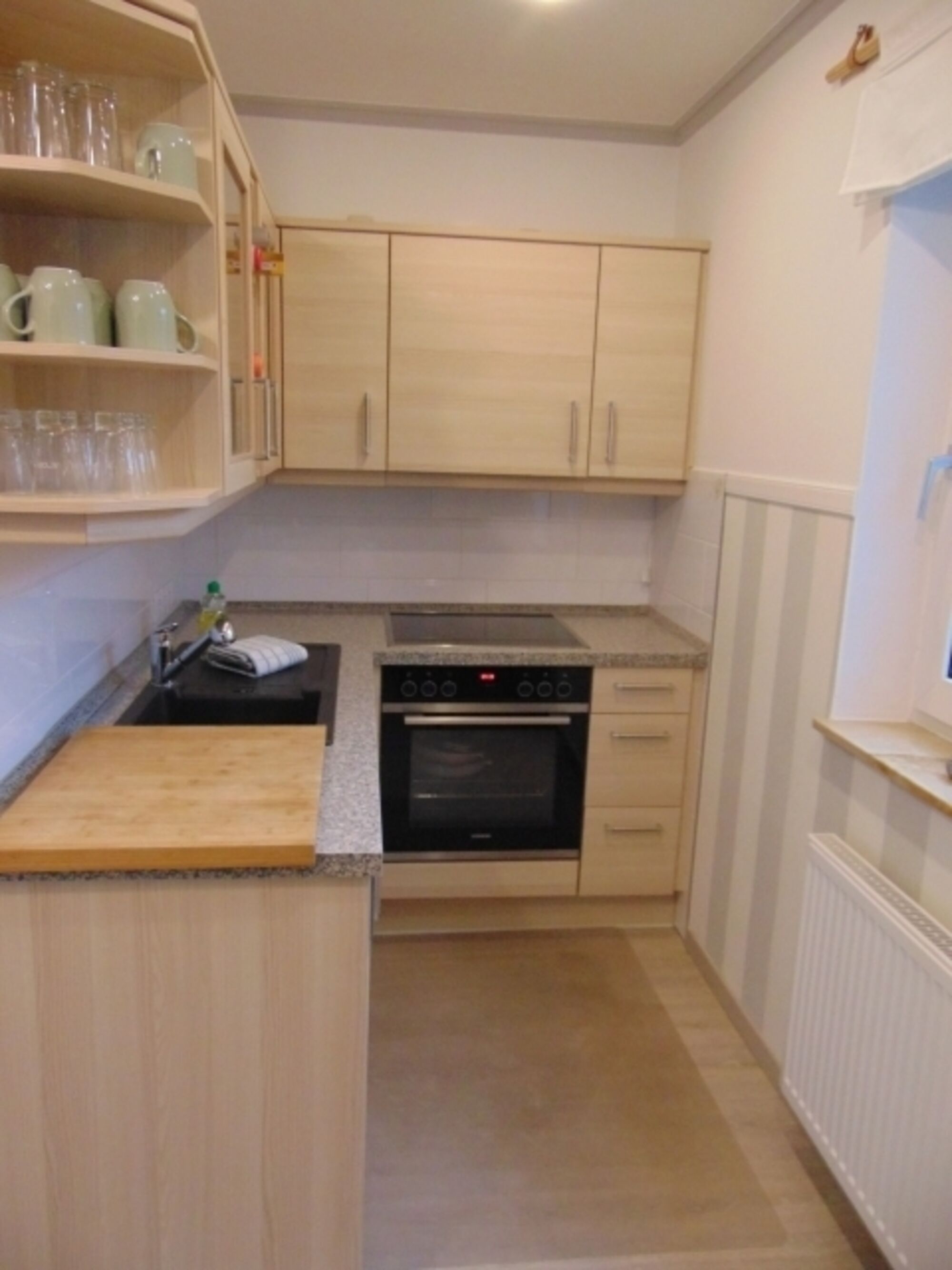 Cerankochfeld, Dunstabzugshaube, Kühlschrank mit Gefrierfach, Eierkocher, Korkenzieher / Flaschenöffner, Gewürze (Salz, Pfeffer, Zucker), Öl / Essig, Geschirrhandtücher, Mülltüten, Essplatz in der Küche