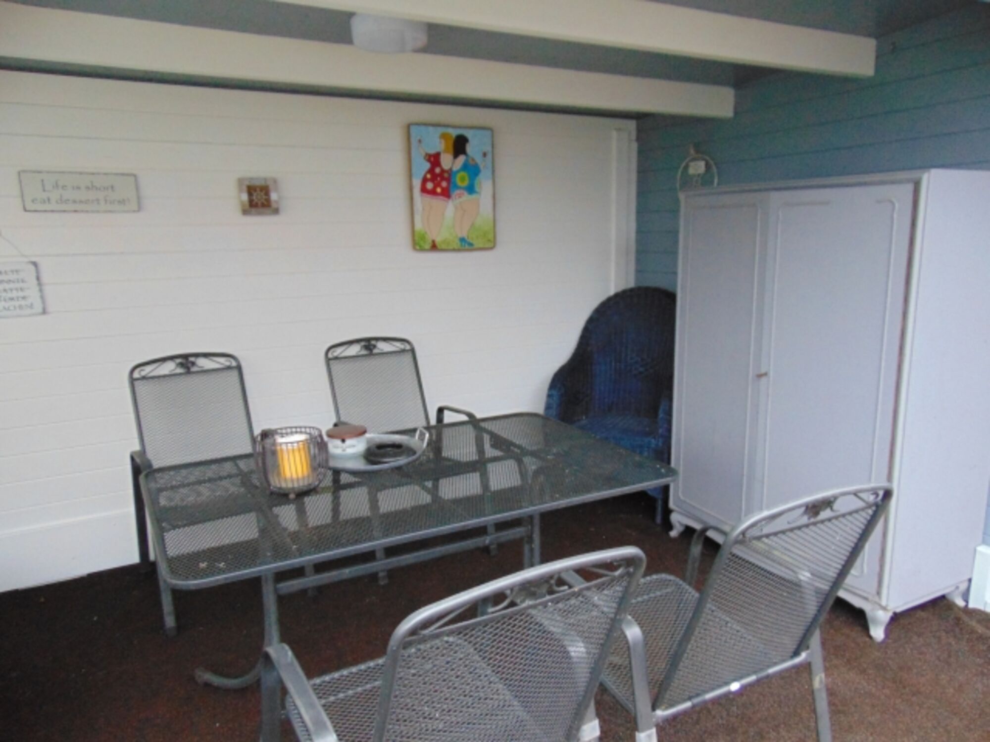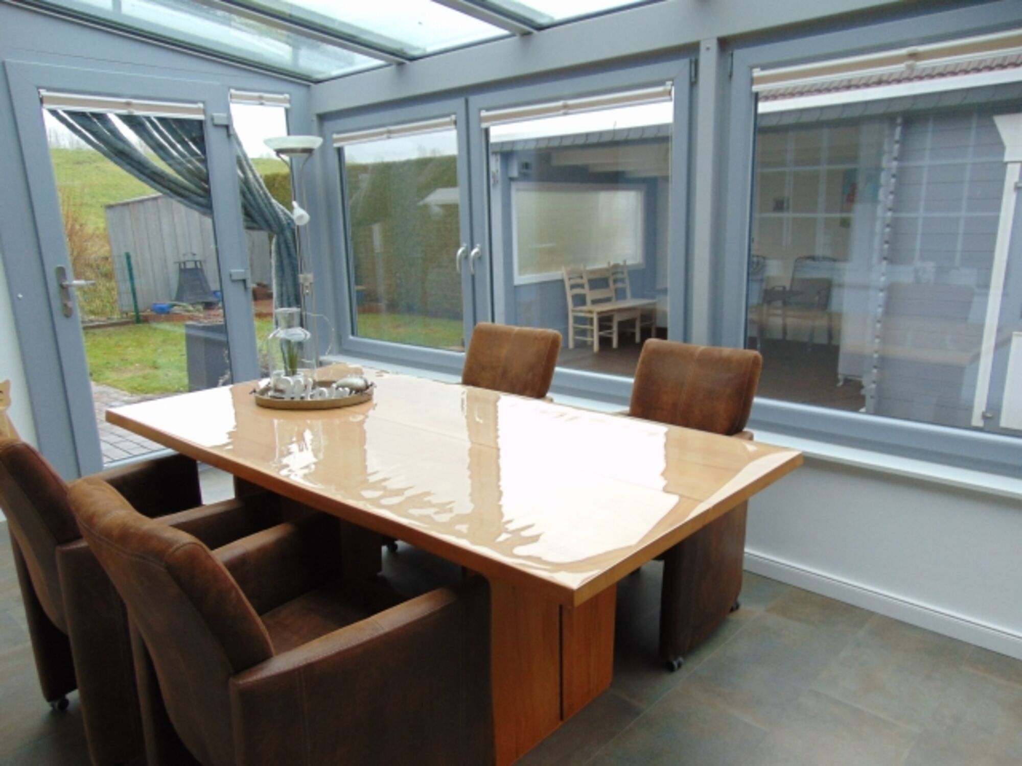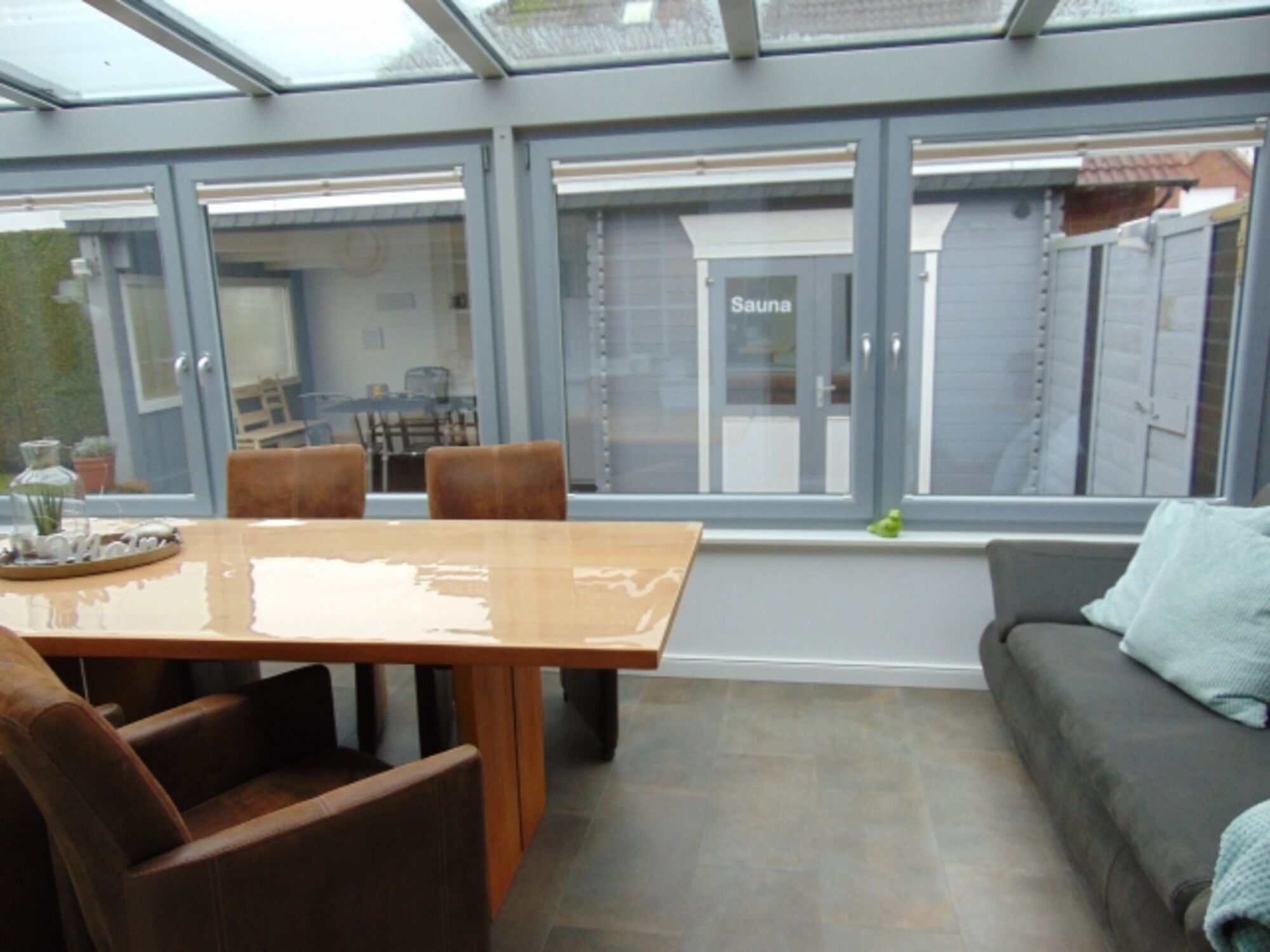 Wintergarten Esstisch, Schlafsofa und Ausgang zum eingezäunten Garten mit Sauna