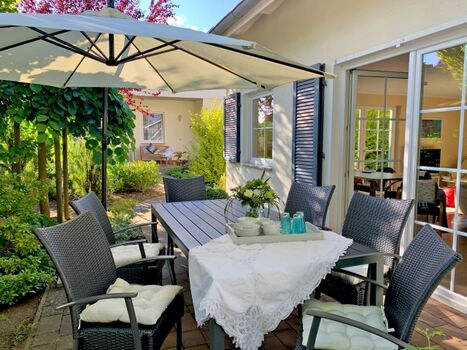 Mehrere Terrassen direkt am Haus bieten Ihnen die Gelegenheit, je nach Stand der Sonne draußen zu sitzen. Die passenden Terrassenmöbel, ein Elektrogrill und sogar ein Strandkorb zum Einkuscheln sind vorhanden. Ein Spielplatz mit Wikingerschiff für Kinder befindet sich direkt im Garten. Die Balkon- bzw. Terrassenmöbel stehen saisonal - in der Regel von Mai bis Ende September - zur Verfügung.