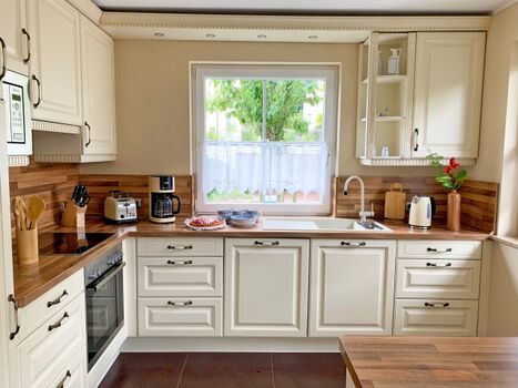 Die Einbauküche Ihres Urlaubsdomizils sieht nicht nur chic und modern aus, sondern ist auch überaus komfortabel ausgestattet. Sie finden hier u.a. einen 4-Platten-Ceranherd mit Backofen, eine Mikrowelle, einen Geschirrspüler, einen Kühlschrank mit Gefrierfach sowie eine Kaffeespezialitätenmaschine inkl. Erstbefüllung mit Kaffeebohnen, einen Wasserkocher und einen Toaster. Besteck, Geschirr, Gläser, Pfannen, Töpfe und weiteres Kleininventar sind natürlich ebenfalls reichhaltig vorhanden. So können Sie Ihren Kochkünsten freien Lauf lassen, wenn Sie nicht gerade unterwegs in einem der vielen guten Restaurants der Insel essen gehen.