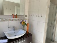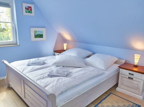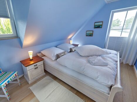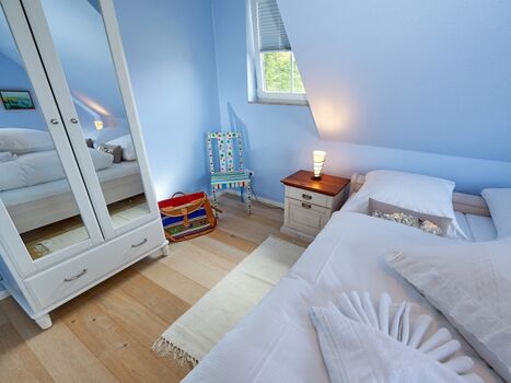 Eine Treppe höher geht es unter halbhoch ansetzenden Dachschrägen ebenfalls sehr gemütlich und komfortabel zu. Die beiden größeren Schlafzimmer sind jeweils mit einem kuscheligen Doppelbett in 1,80 x 2,00 m Größe ausgestattet, das dritte Schlafzimmer bietet zwei Einzelbetten. Genügend Platz für ein Baby-Reisebettchen und Ihre Urlaubsgarderobe ist natürlich auch vorhanden. Der Komfort des zweiten Badezimmers auf dieser Etage ist besonders dann angenehm, wenn man hier im Ferienhaus Klünderberg seinen Urlaub mit der ganzen Familie verlebt.