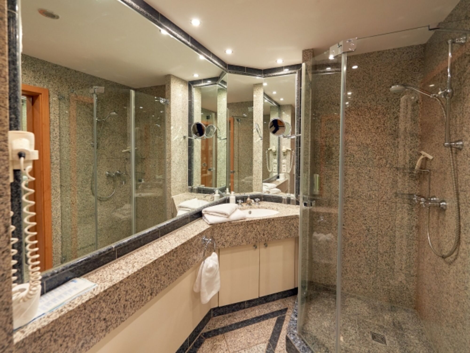 Das mit Granitfliesen, großen Spiegelflächen und viel Licht aufwändig inszenierte Badezimmer verfügt über Dusche/WC, einen beleuchteten Waschtisch inkl. Kosmetikspiegel und Fön sowie einen beheizbaren Handtuchtrockner.