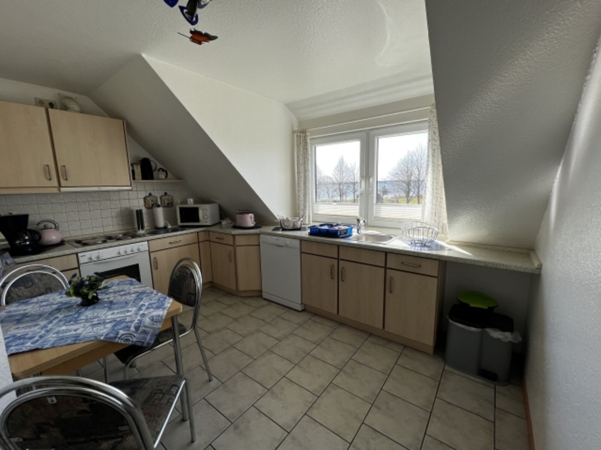 4-Platten Herd, Dunstabzugshaube, Kühlschrank mit Gefrierfach, Eierkocher, Mixer, Geschirrhandtücher, Mülltüten, Essplatz in der Küche