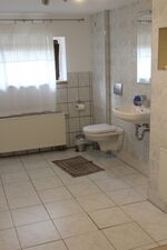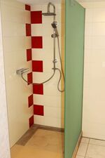 Bitte beachten Sie, dass die Sauna pro Stunde 6€ kostet und für den Münzautomaten 2€ Münzen benötigt werden. Waschbecken, Regendusche, Spiegel, Fenster im Bad
