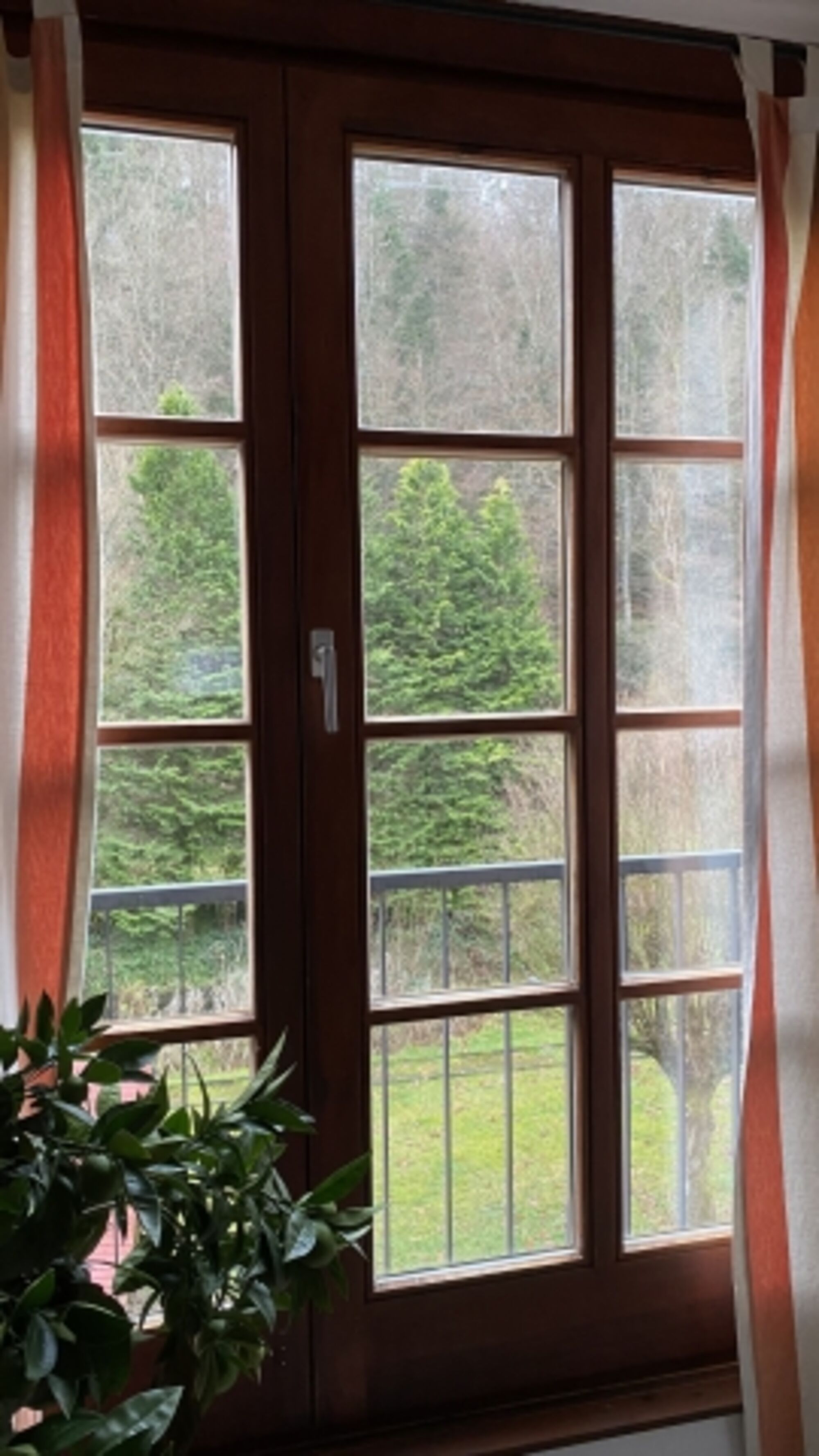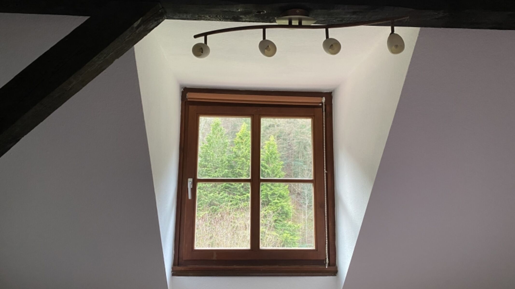 Großes Fenster mit Blick zum Wald.