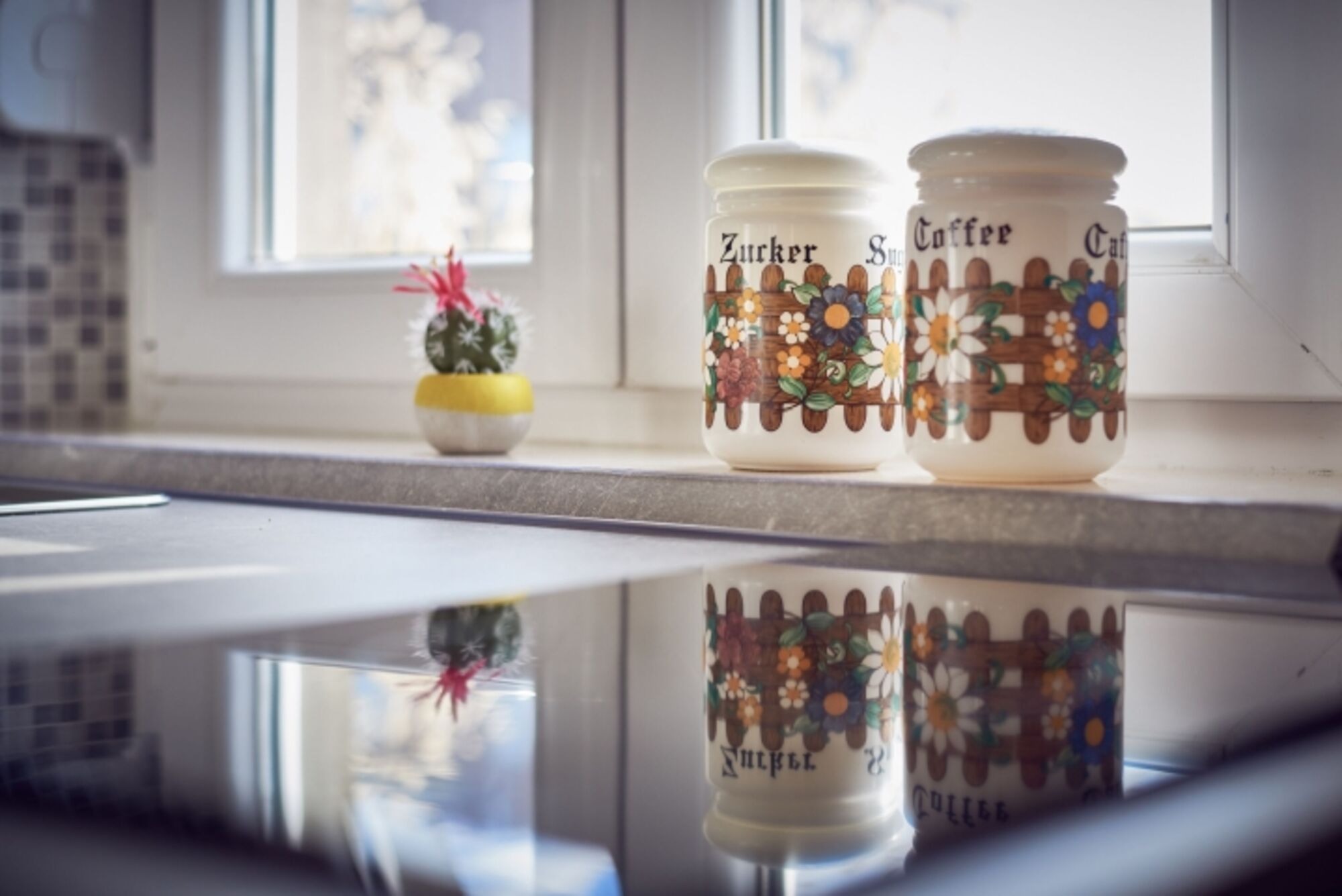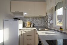 2-Platten Herd, Kühlschrank mit Gefrierfach, Geschirrhandtücher, Essplatz in der Küche