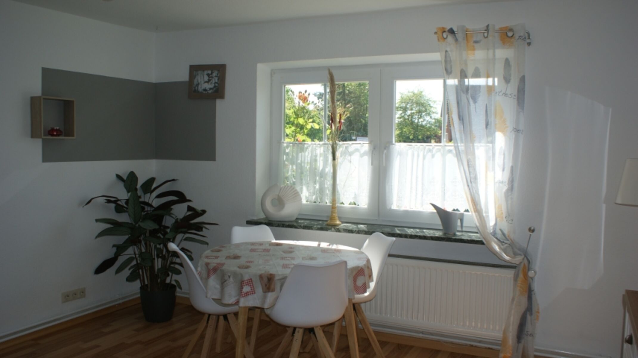 Wohnzimmer / Esszimmer mit gemütlichem großen Ledersofa und einem Esstisch mit bis zu sechs Stühlen, SAT-TV, 55 Zoll Smart-TV, Stereoanlage
