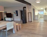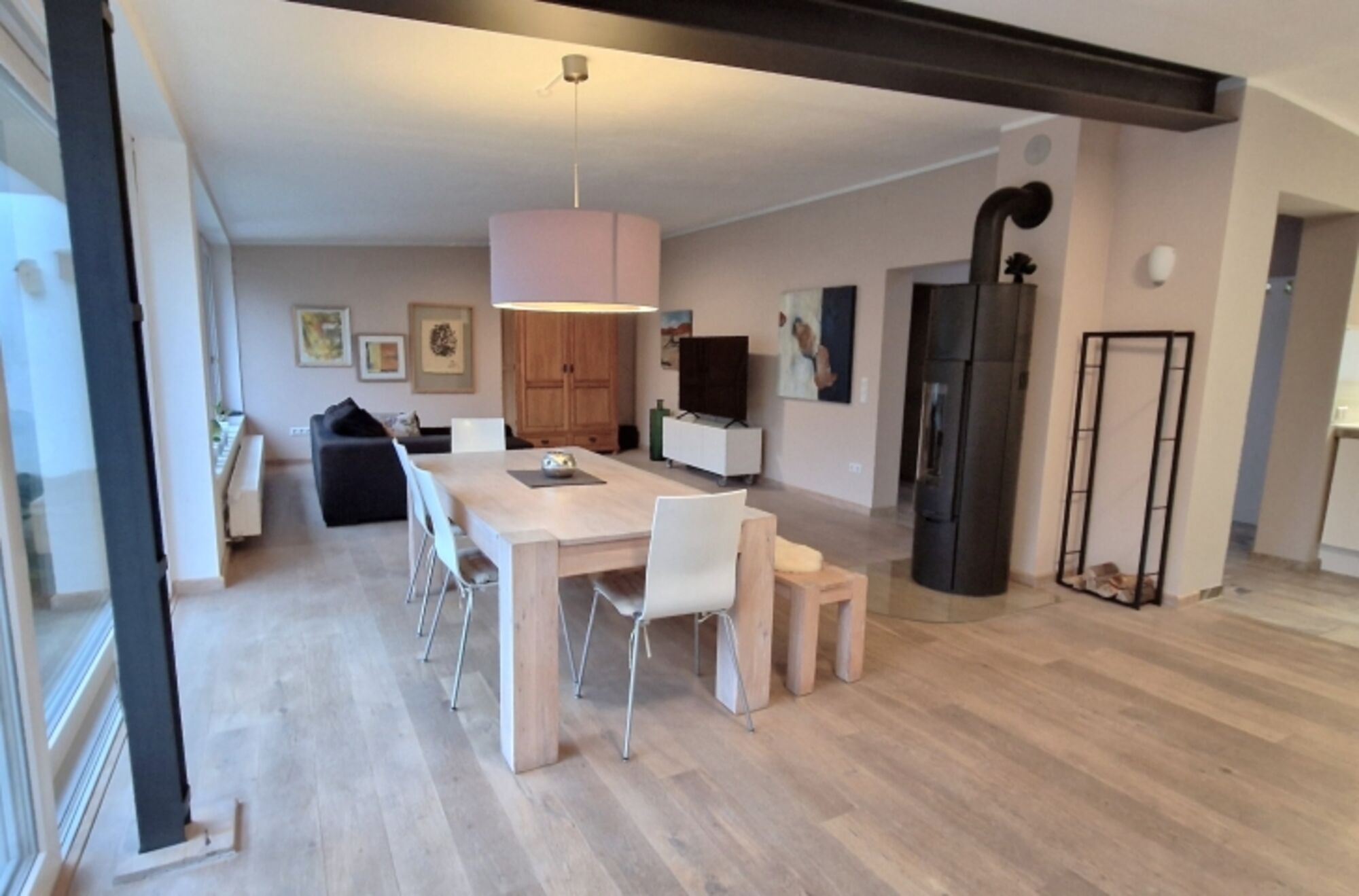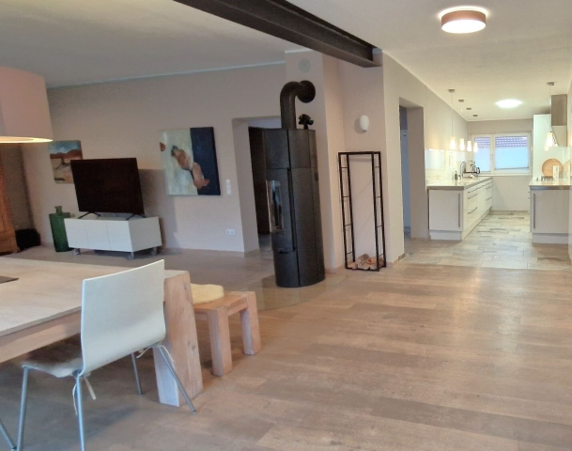 Die Wohnung hat einen großzügigen Wohn-/Essbereich mit einem schönen Blick in den Garten durch die großen Fenster.