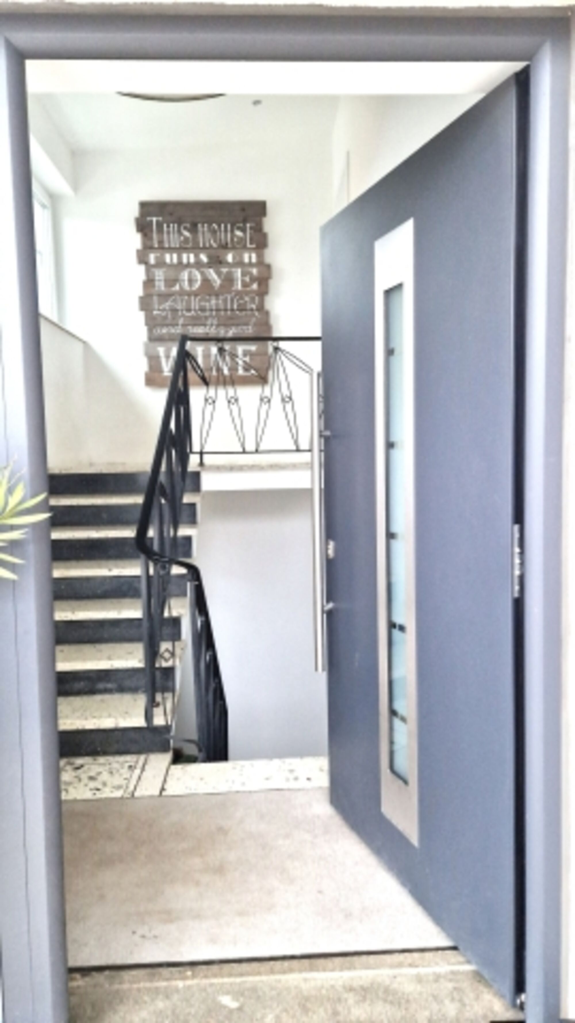 Die Wohnung liegt im ersten Stock eines einstöckigen Einfamilienhauses mit Einliegerwohnung. Der Zugang hat eine Treppe, doch in den Garten geht es ebenerdig, da das Haus an einem Hang liegt.