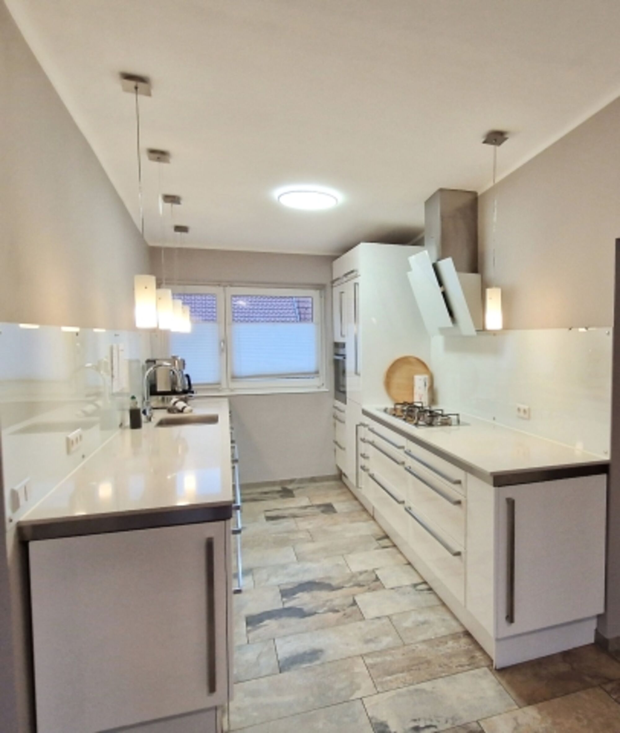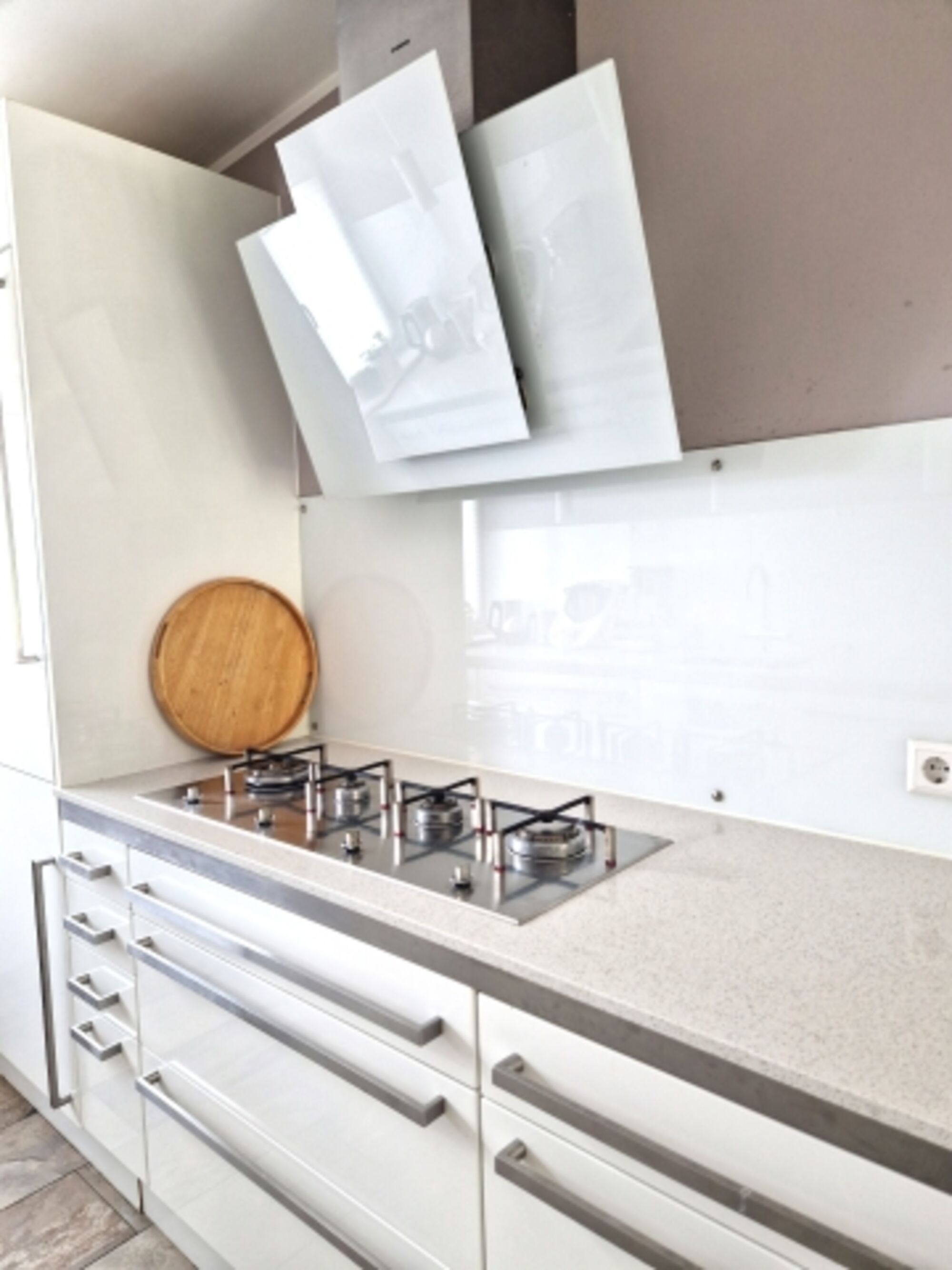 Gasofen / Gasherd, Dunstabzugshaube, Gefrierschrank, Eierkocher, Waffeleisen, Korkenzieher / Flaschenöffner, Gewürze (Salz, Pfeffer, Zucker), Geschirrhandtücher, Mülltüten