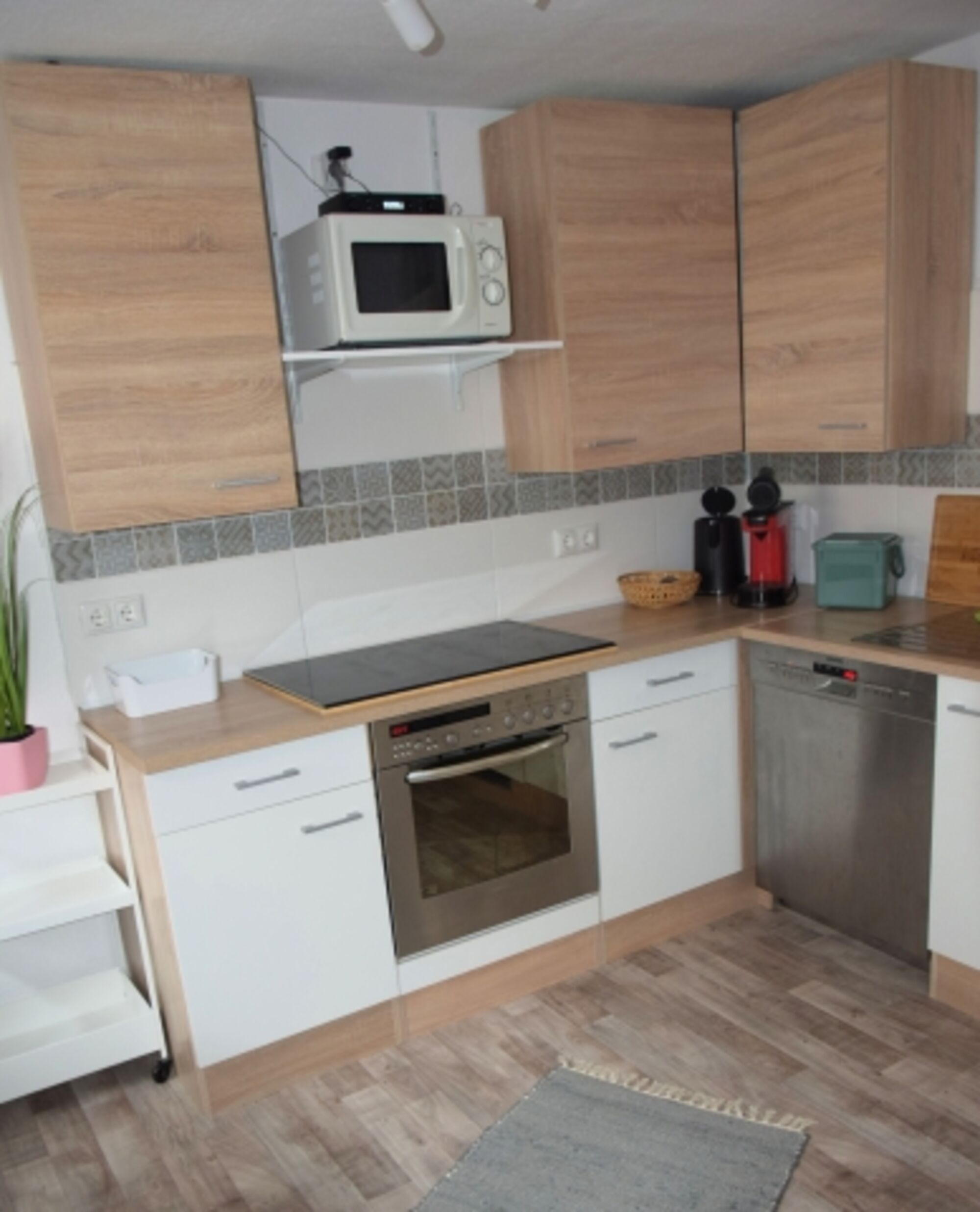 4-Platten Herd, Cerankochfeld, Kühlschrank mit Gefrierfach, Gefrierschrank, Senseo-Kaffeeautomat, Mixer, Gewürze (Salz, Pfeffer, Zucker), Geschirrhandtücher, Mülltüten, Essplatz in der Küche