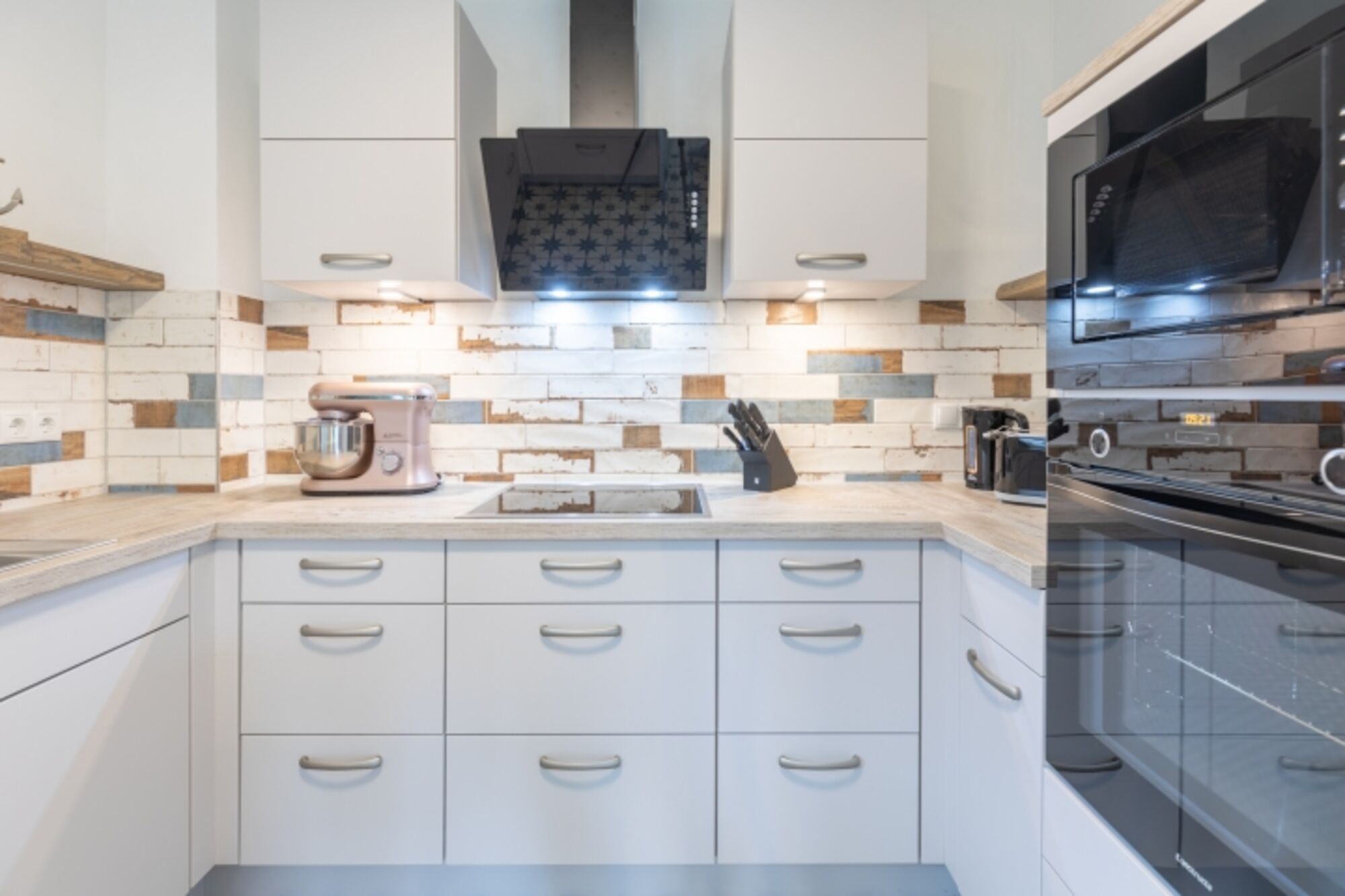 Cerankochfeld, Induktionsherd, Dunstabzugshaube, Kühlschrank mit Gefrierfach, Gefrierschrank, Kaffeevollautomat, Küchenmaschine, Mixer, Korkenzieher / Flaschenöffner, Gewürze (Salz, Pfeffer, Zucker), Öl / Essig, Mülltüten, Essplatz in der Küche