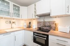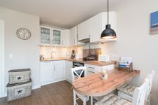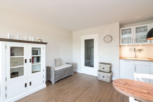 Der Wohnbereich hat eine Essecke und daran angeschlossen ist die offene Küche. Diese hat u. a. einen Geschirrspüler, Wasserkocher und Mikrowelle.