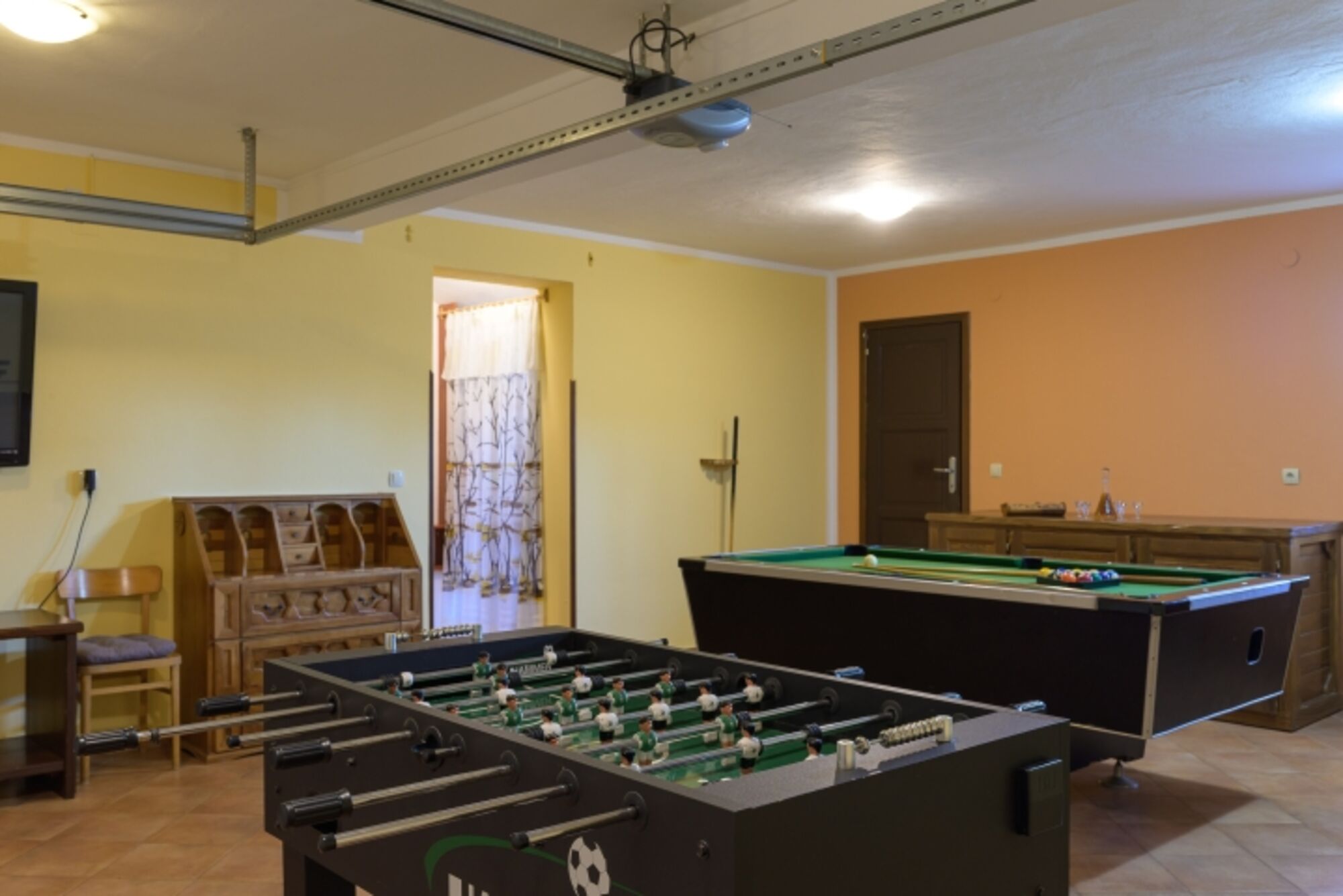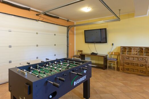 Die Gäste können den privaten Pool und die entspannende überdachte Terrasse genießen. Für Unterhaltung im Innenbereich steht ein Spielzimmer mit Billard, Tischfußball, Dart und einer Videospielkonsole zur Verfügung.