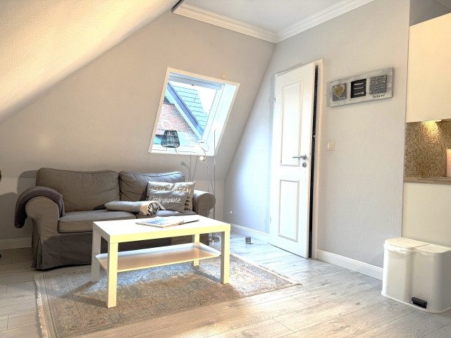 Diese kleine und gemütlich eingerichtete 2-Zimmer Wohnung für 2 Personen liegt im Obergeschoss, teilweise mit Schrägen. Sie wurde laufend renoviert und modernisiert. Sie verfügt über ein kleines Schlafzimmer mit Doppelbett 180x200 . Ein Wohnzimmer mit Essplatz und einer gemütlichen Sitzecke. Ein kleines innenliegendes Duschbad/WC mit Schrägen.